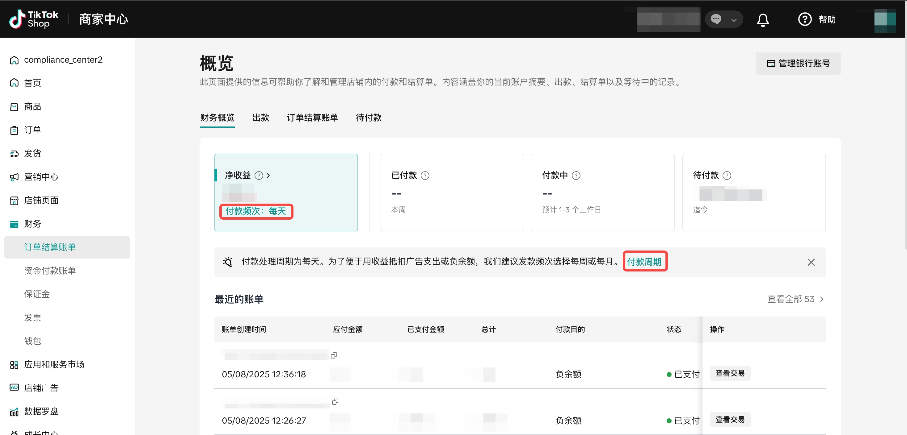 | 步骤1 | 在“财务概览”模块,点击“付款频次:每天”或“付款周期”跳转至付款周期设置页面。 | ![]() ![]() |