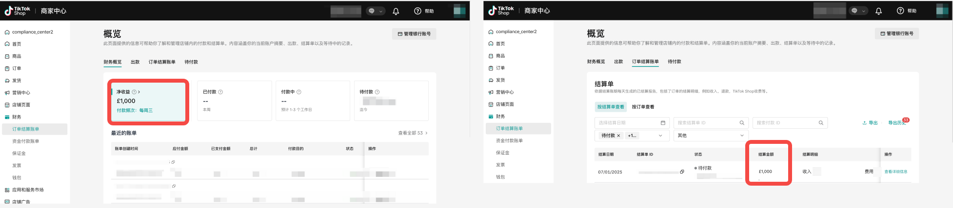 - 7月1日:净收益显示£1,000。点击”>”查看明细,可见待付款的结算单金额为£1,000。