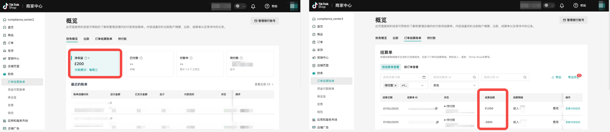 - 7月2日:净收益为£200。查看明细发现待付款的结算单合计为£200(等于£1,000 – £800)。