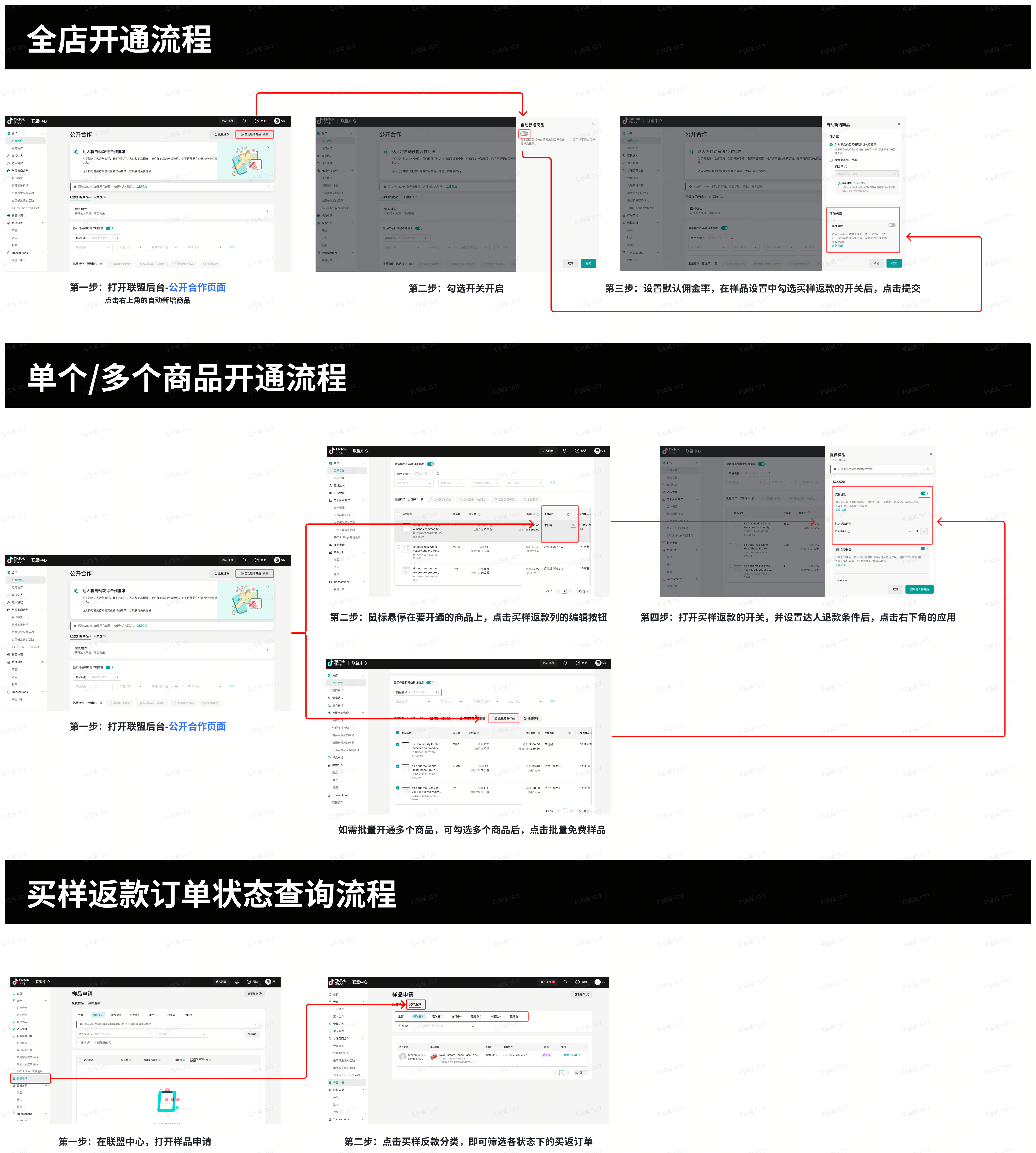 *点击跳转至公开合作管理页面,即可一键开通;*点击跳转至样品申请,即可查询买返订单状态