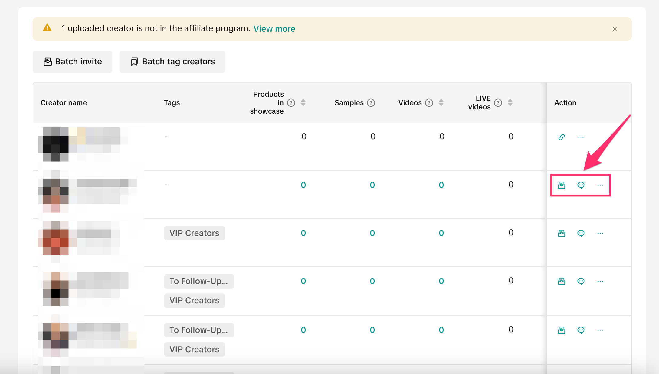 | 为什么我不能邀请达人合作或私信? | 如果你无法邀请或联系达人,可能说明该达人有资格,但很可能还没有加入TikTok Shop联盟。请参考上方步骤的第7步,邀请达人加入TikTok Shop联盟,这样你就能与他们合作 |