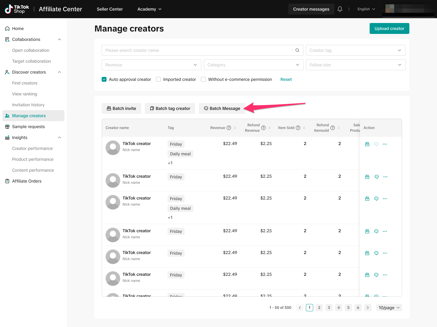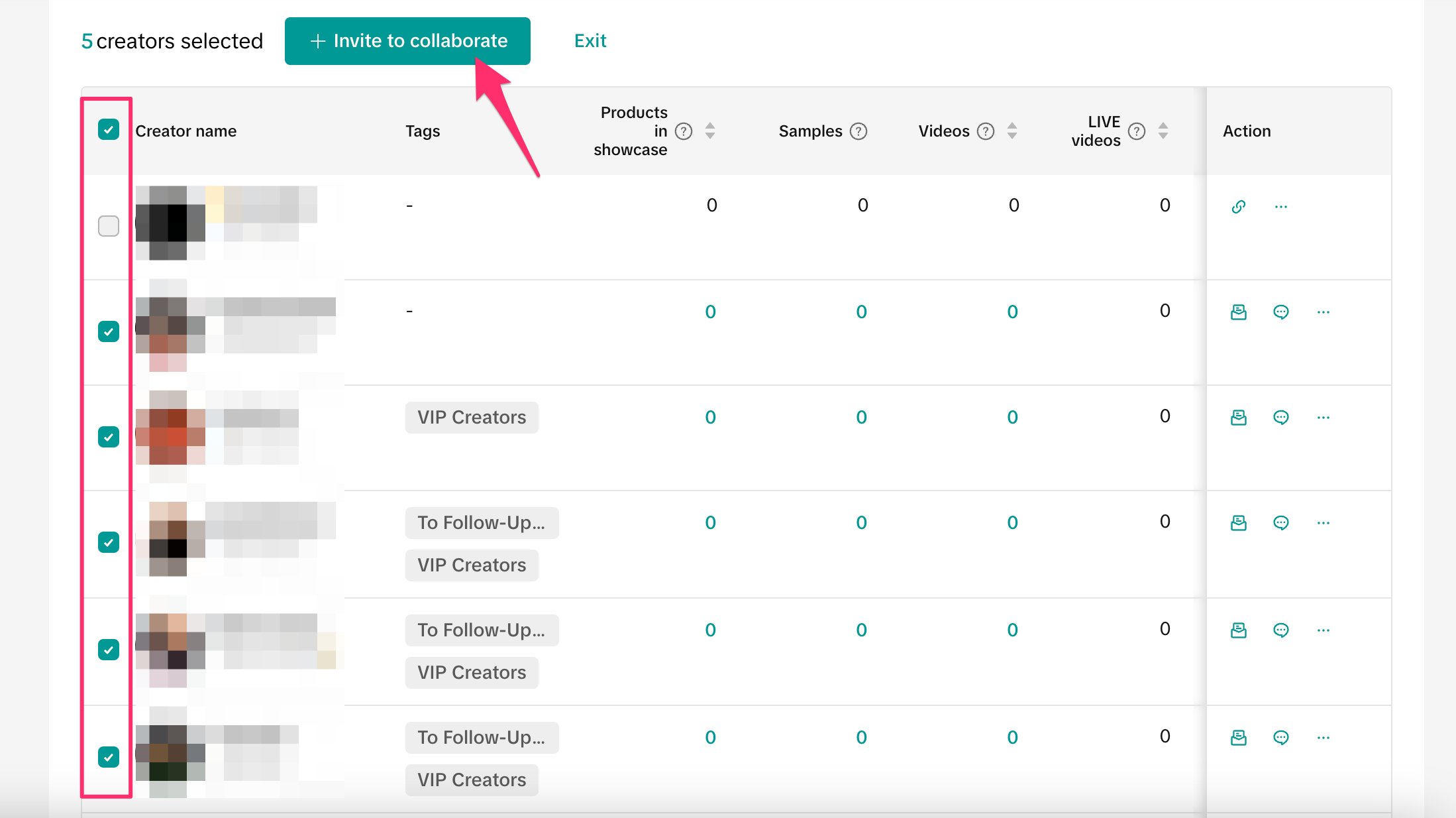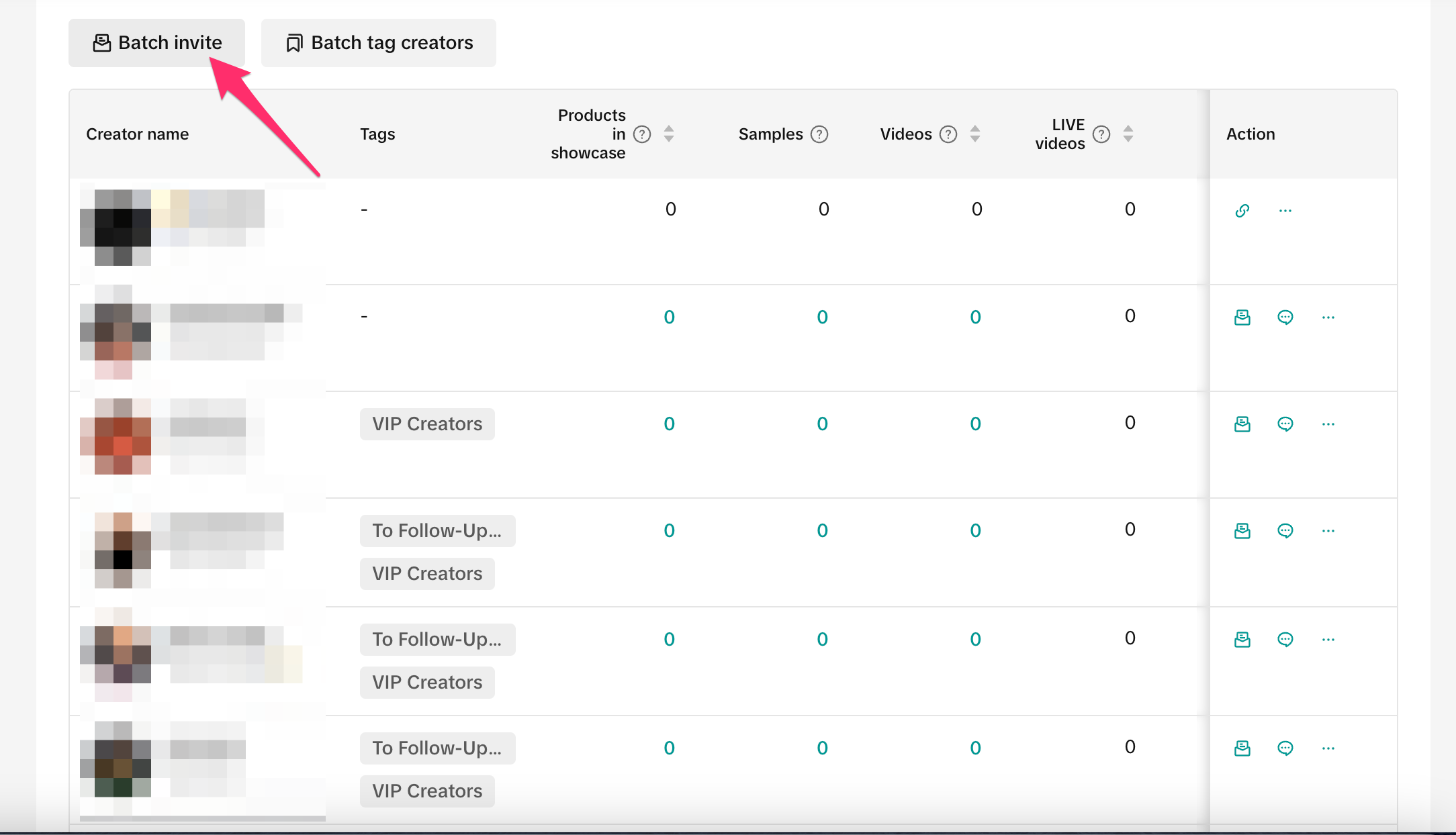 第 9 步: 您可以通过点击「批量邀请」,选择相关达人,然后点击「邀请合作」,批量发送最多 100 位达人的定向邀请。