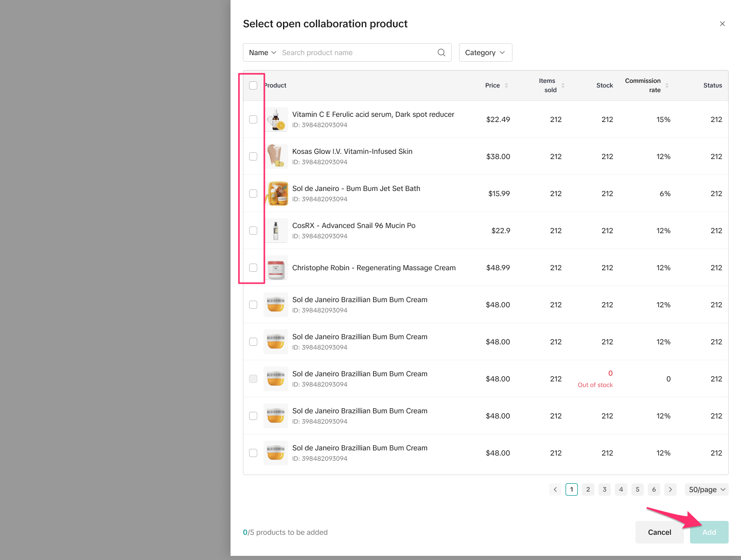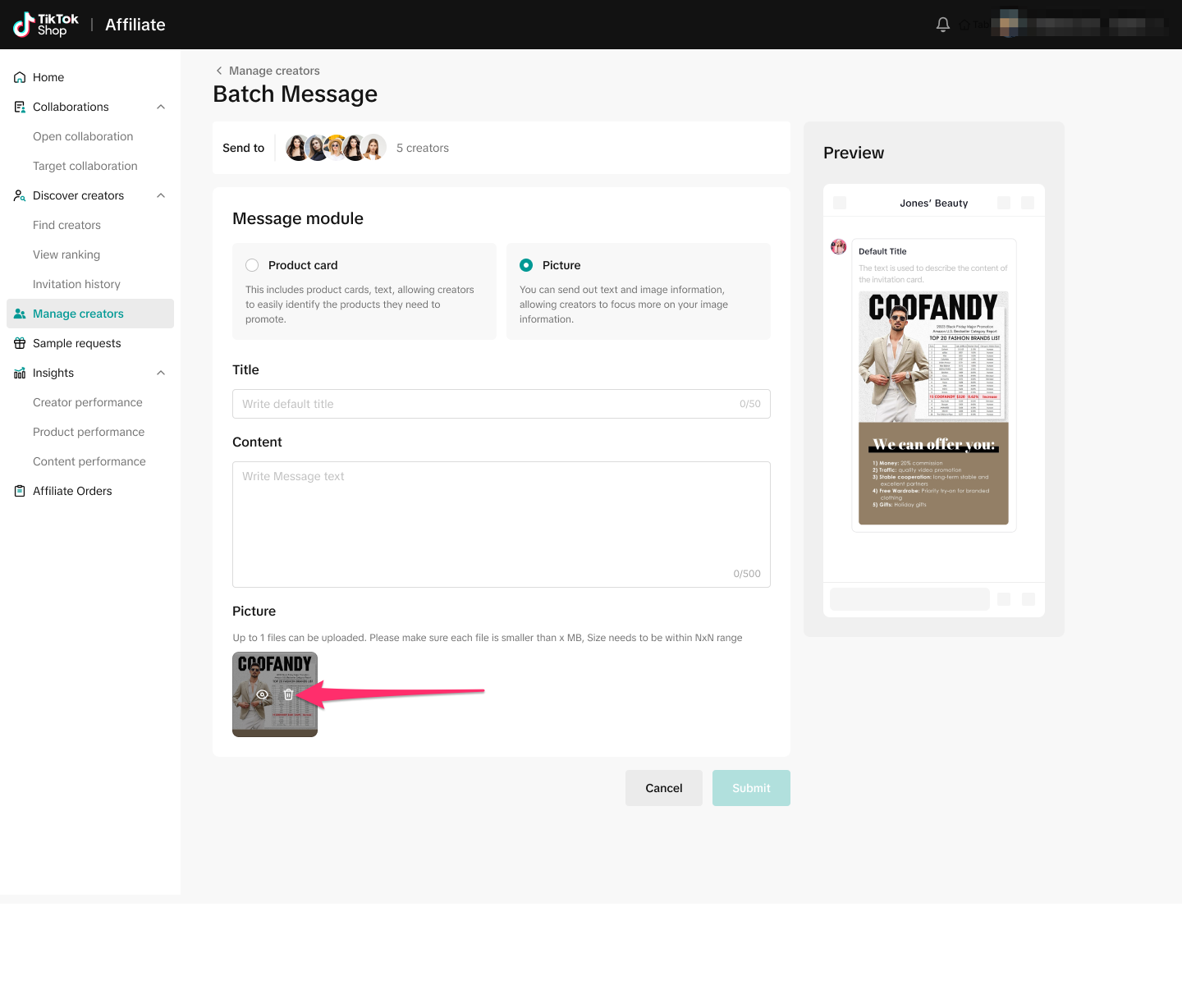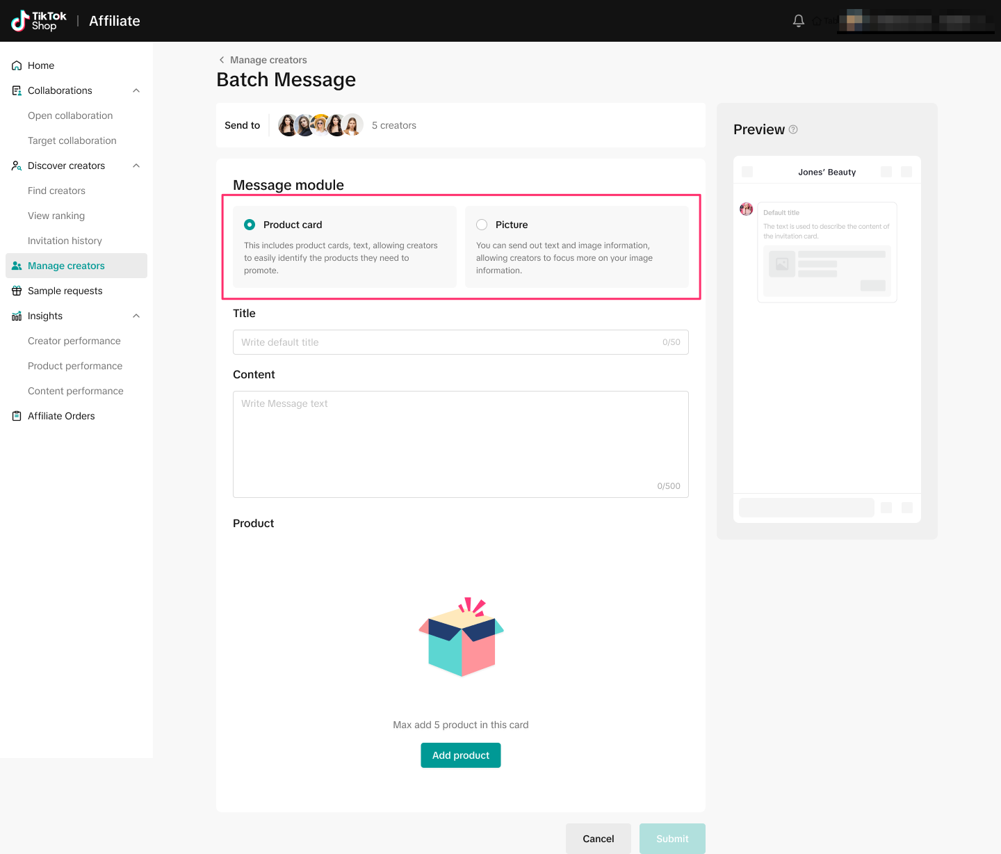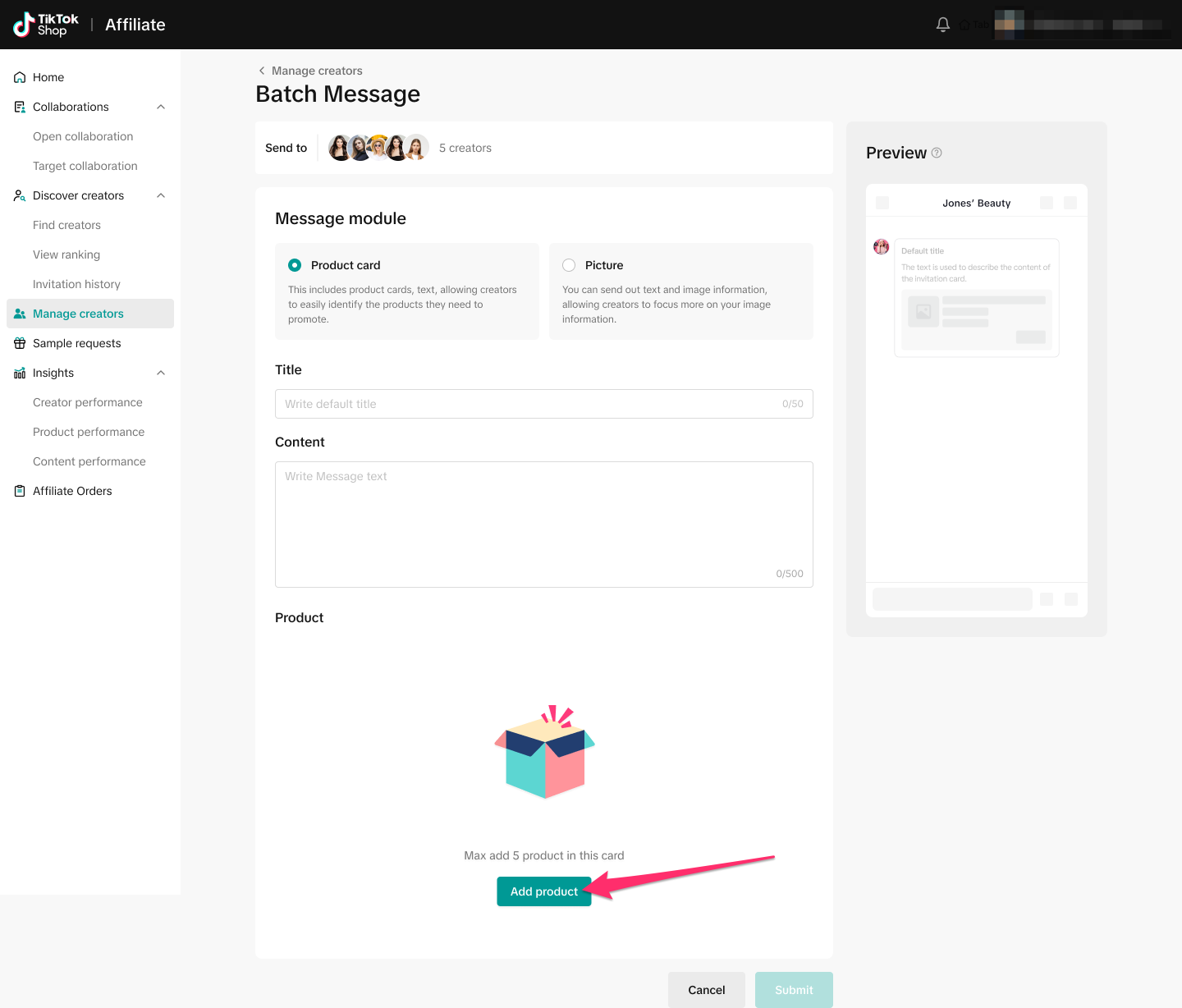 第 9 步: 您可以通过点击「批量邀请」,选择相关达人,然后点击「邀请合作」,批量发送最多 100 位达人的定向邀请。