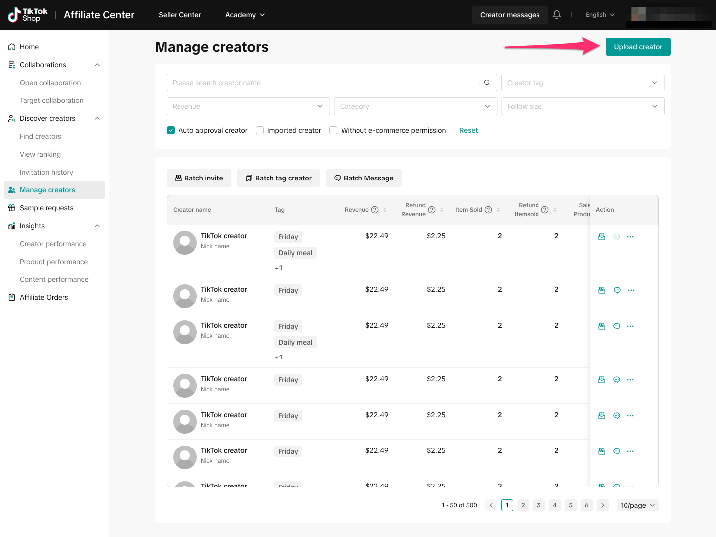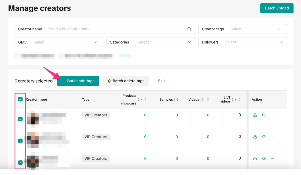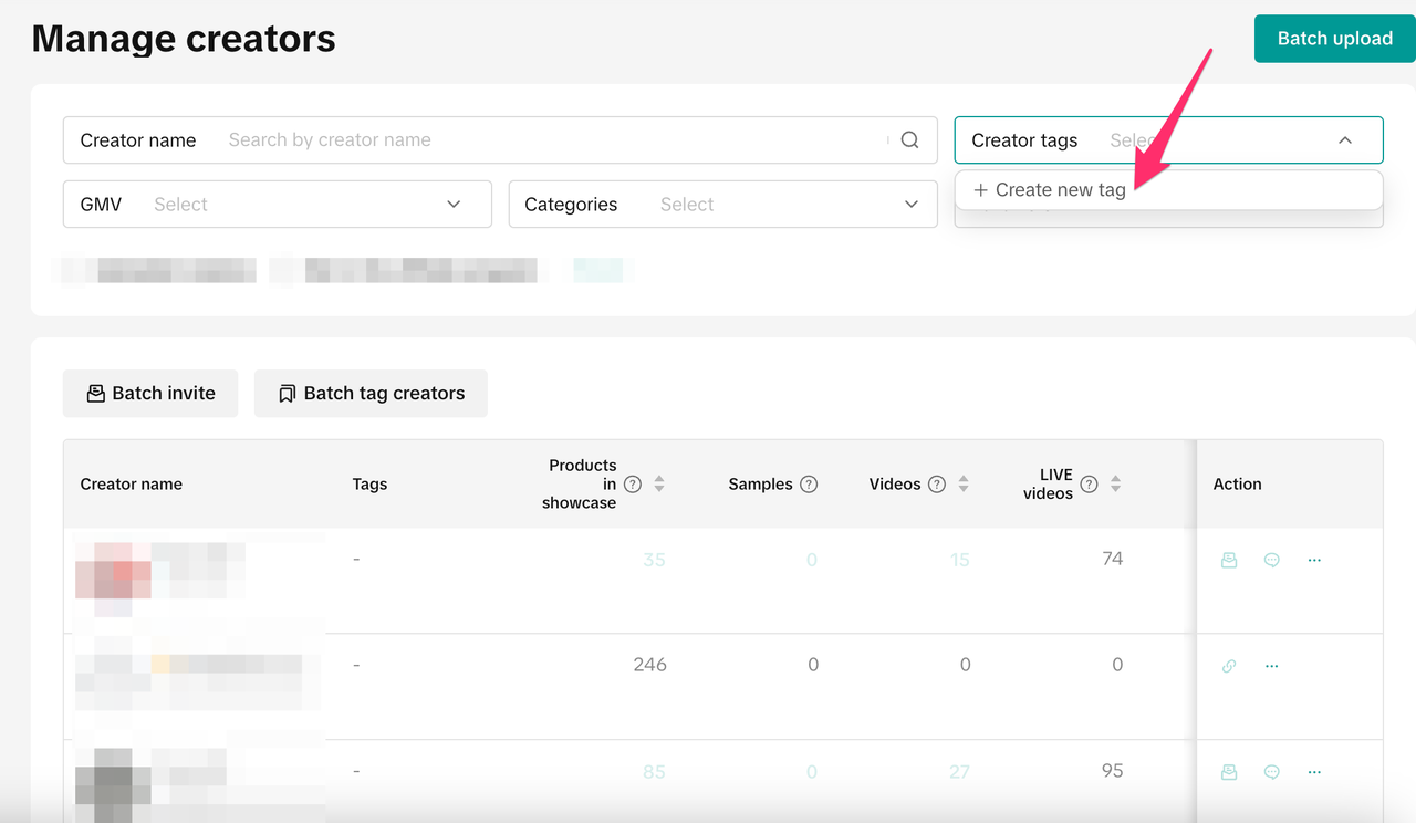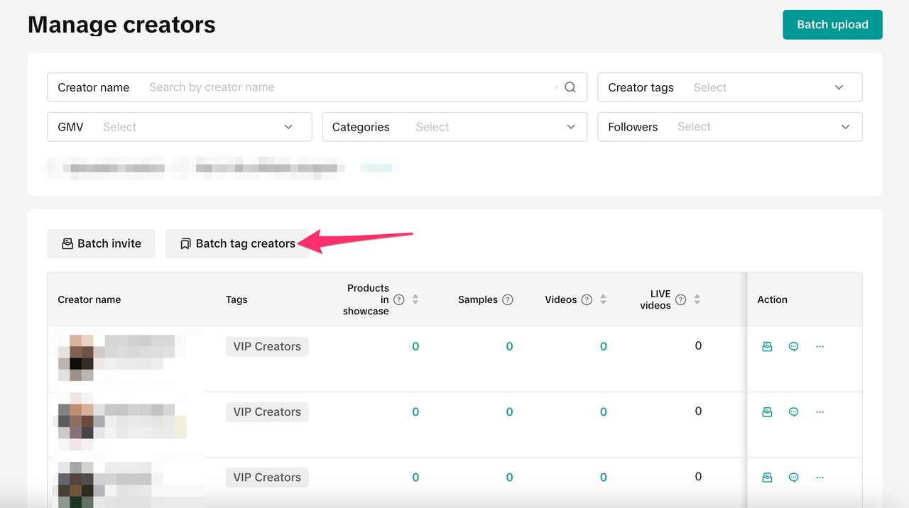 点击「批量上传」以手动导入这些您尚未在 TikTok Shop上合作过的达人。