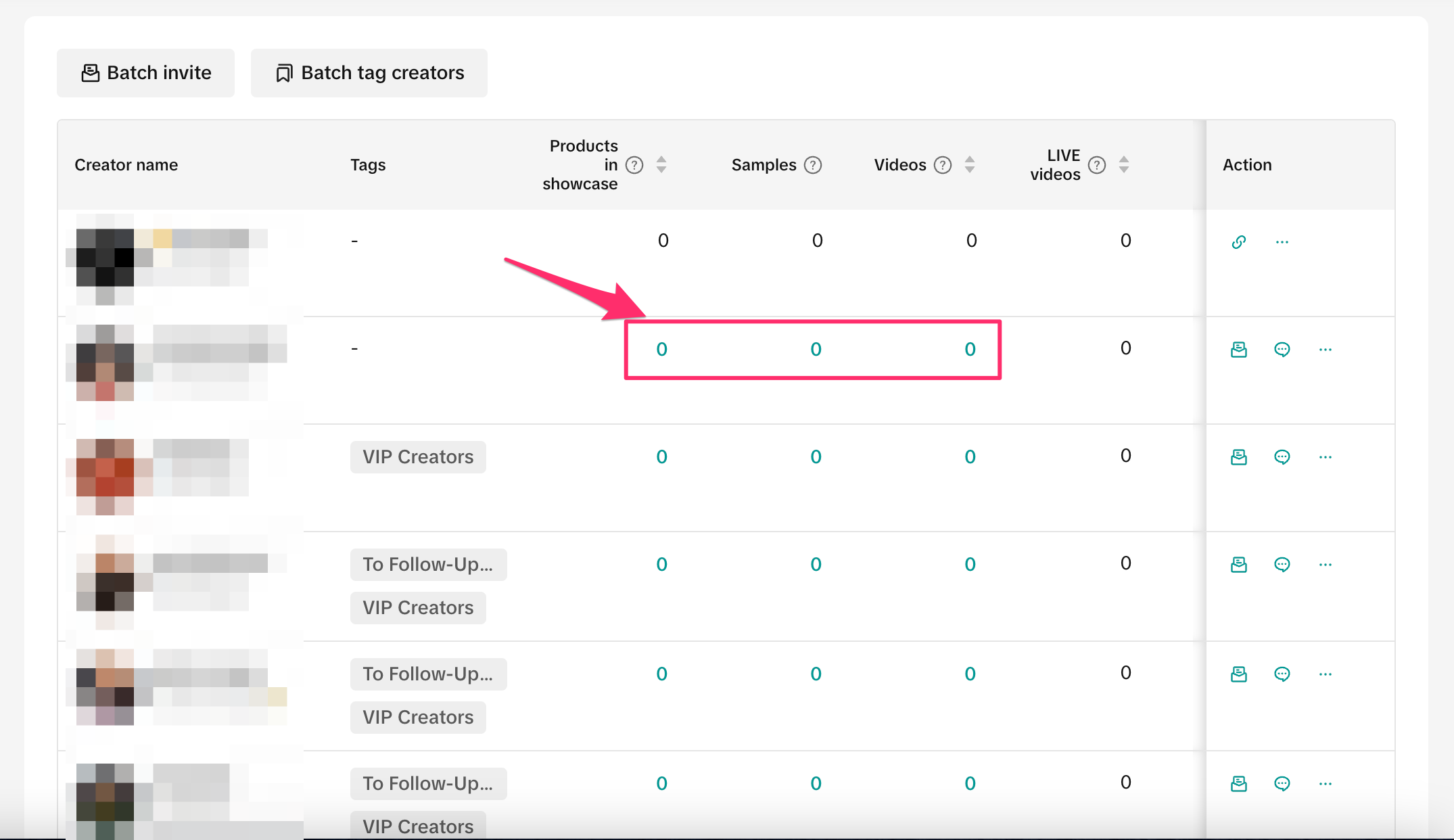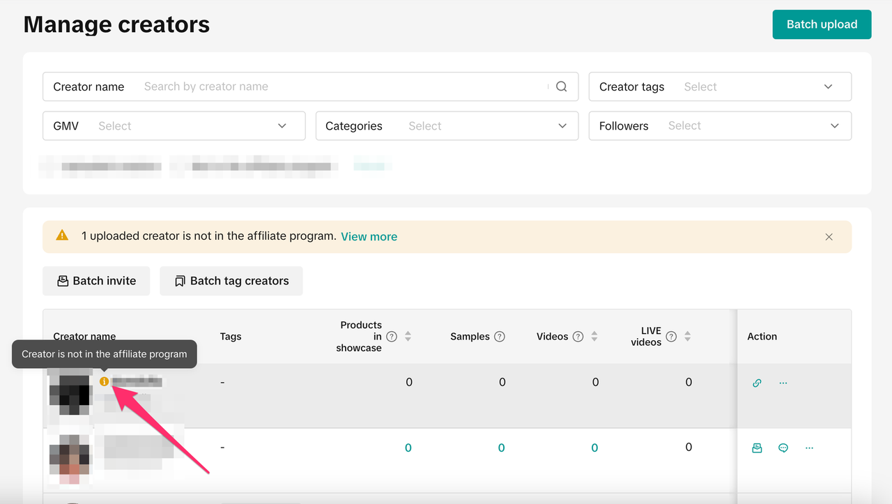 | 为什么批量上传工具无法识别Excel文件中的达人? | 确保你发布的是达人的TikTok用户名,而不是他们在其他平台上的账号。你还要确保遵循模板中显示的格式。如果达人仍然无法导入,很可能是因为该达人不符合加入TikTok Shop联盟的资格 |