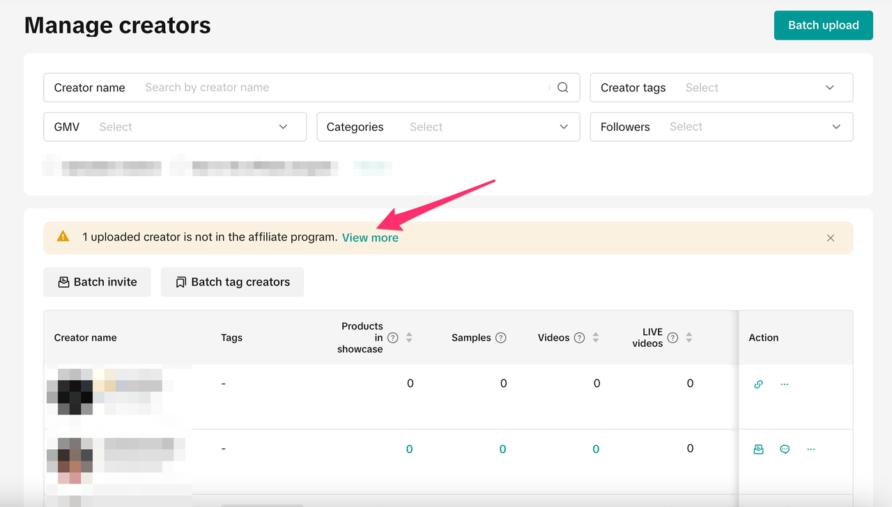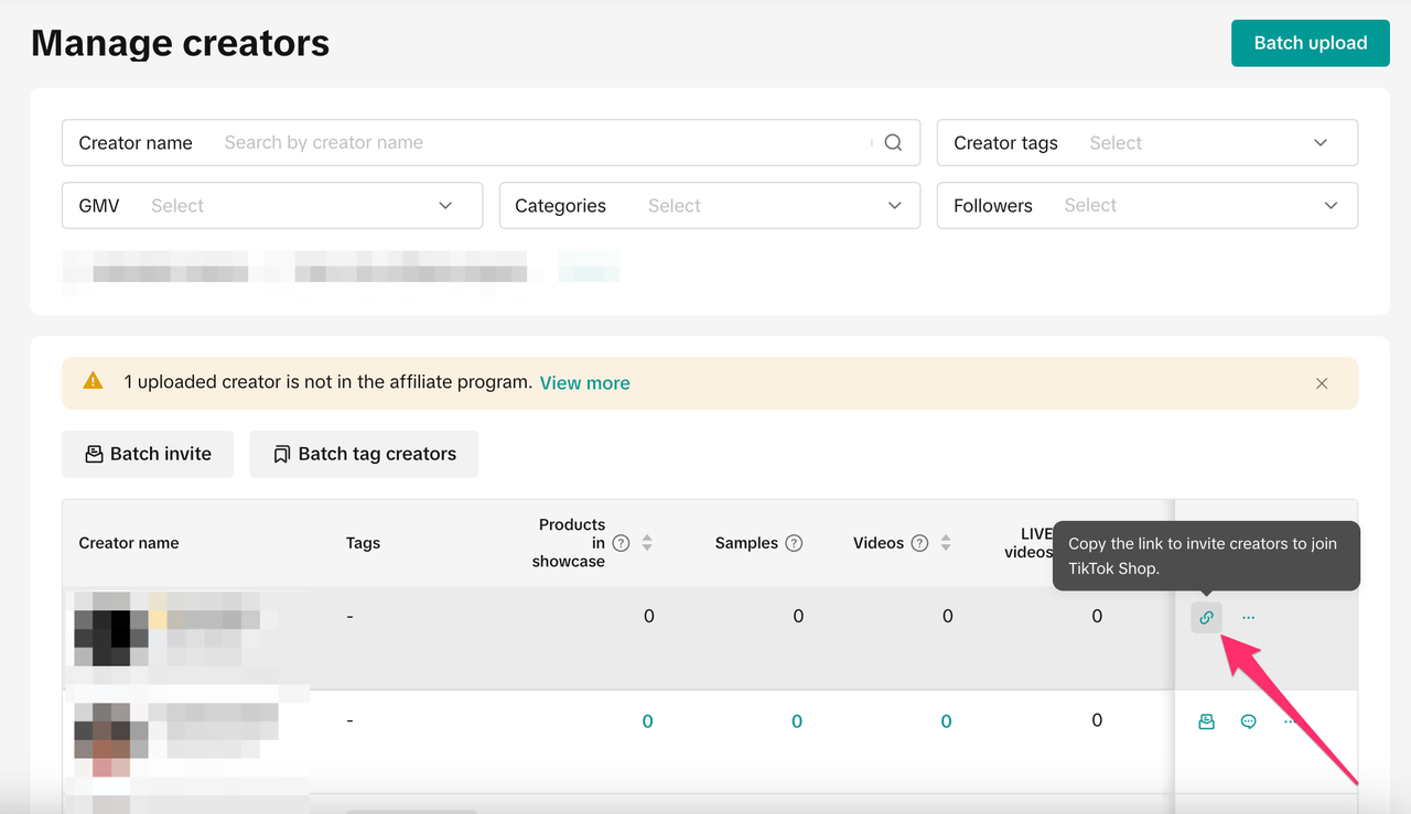 未加入联盟计划: 您通过「批量上传」功能手动上传且尚未加入 TikTok Shop联盟的达人。
