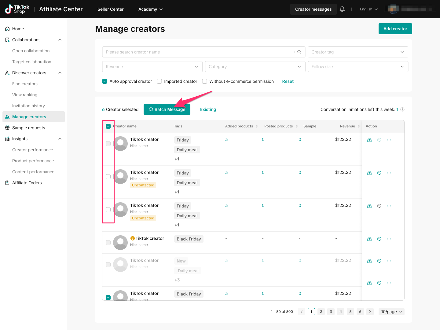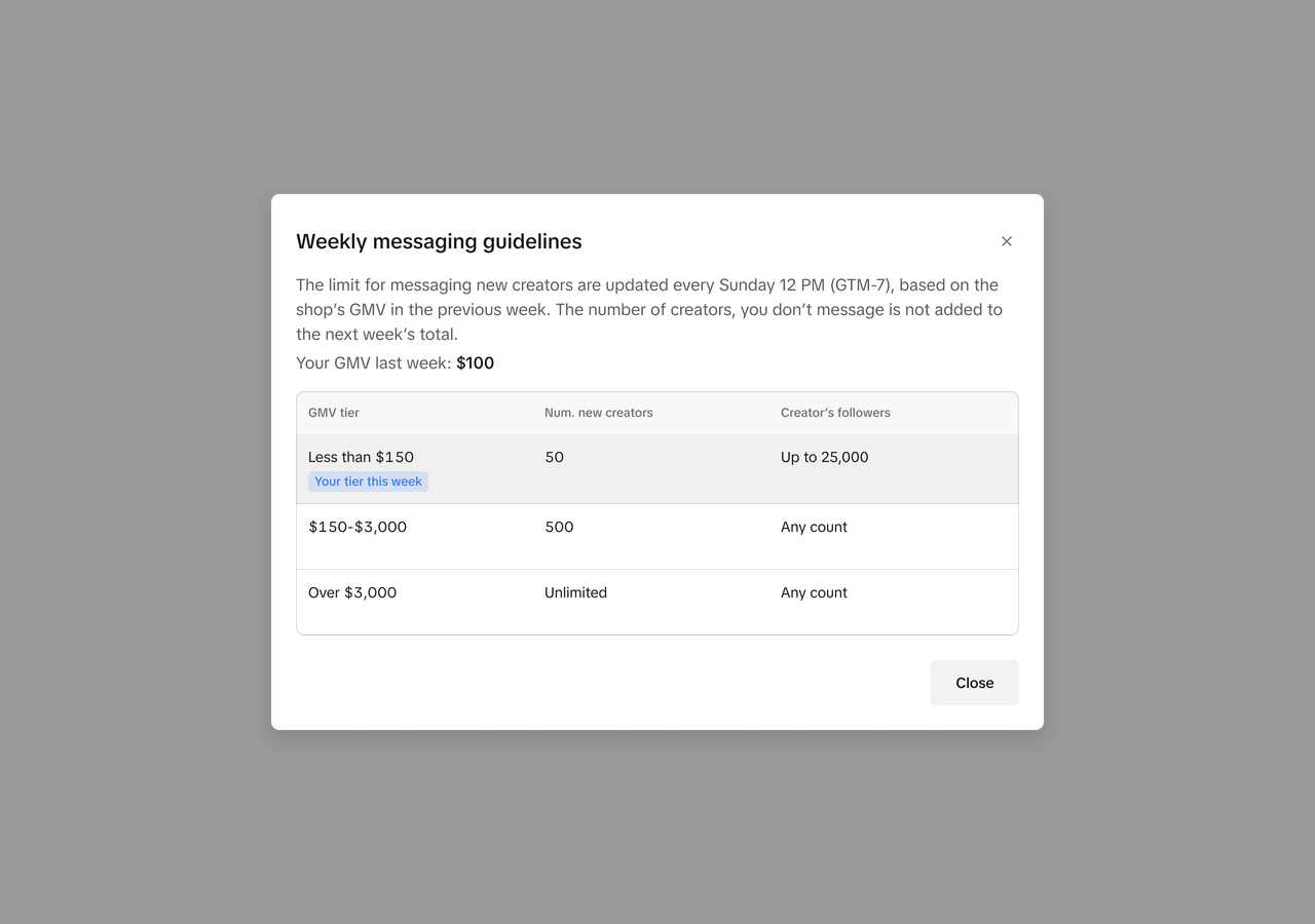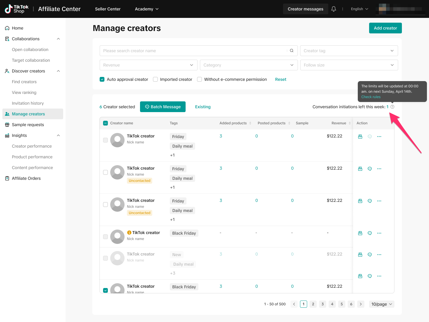 注意: TikTok 根据您每周的 GMV 限制您可以发送给达人的消息数量。查看「本周剩余对话发起次数」以了解您本周剩余的消息条数。点击「查看规则」以了解详细规则。