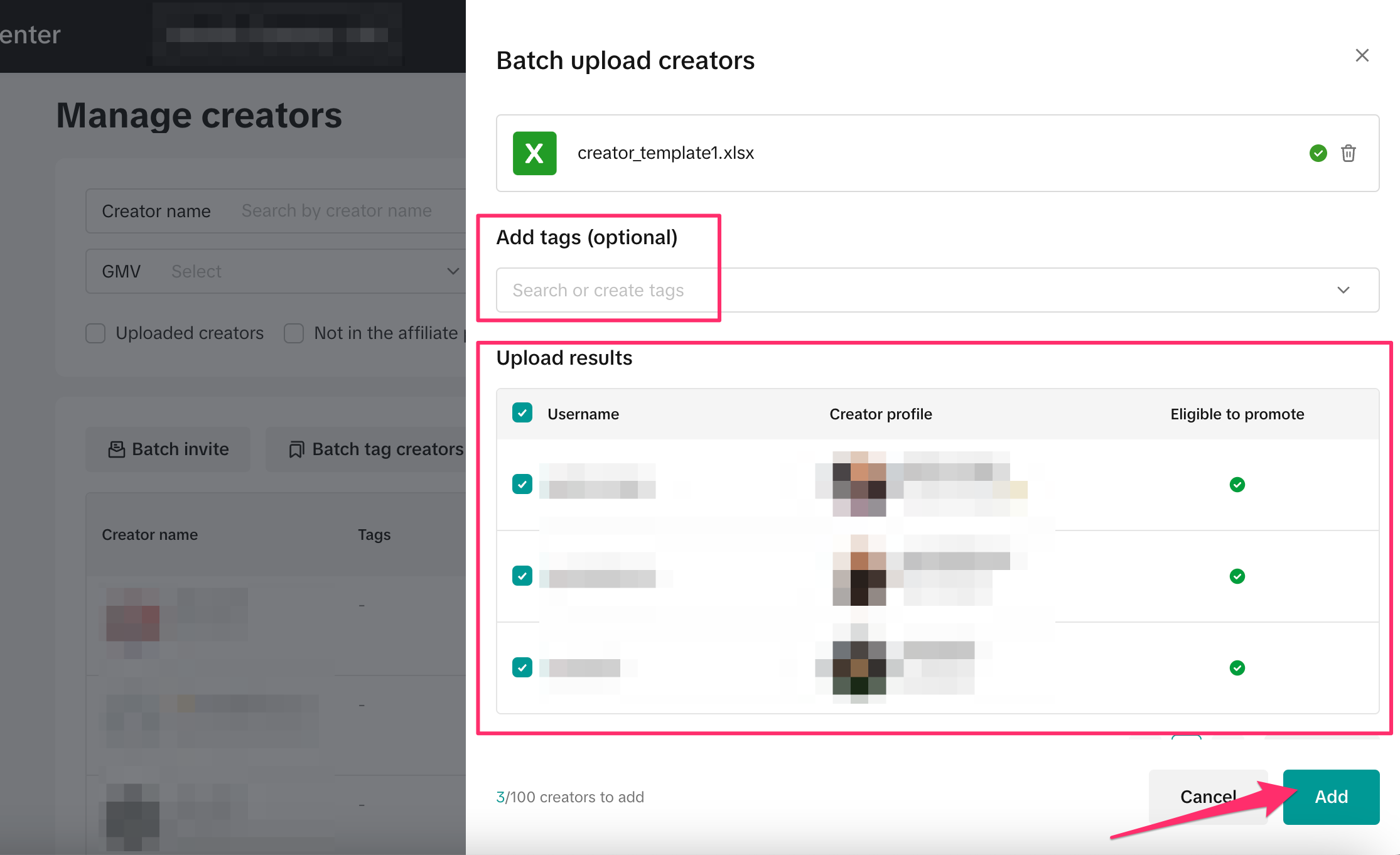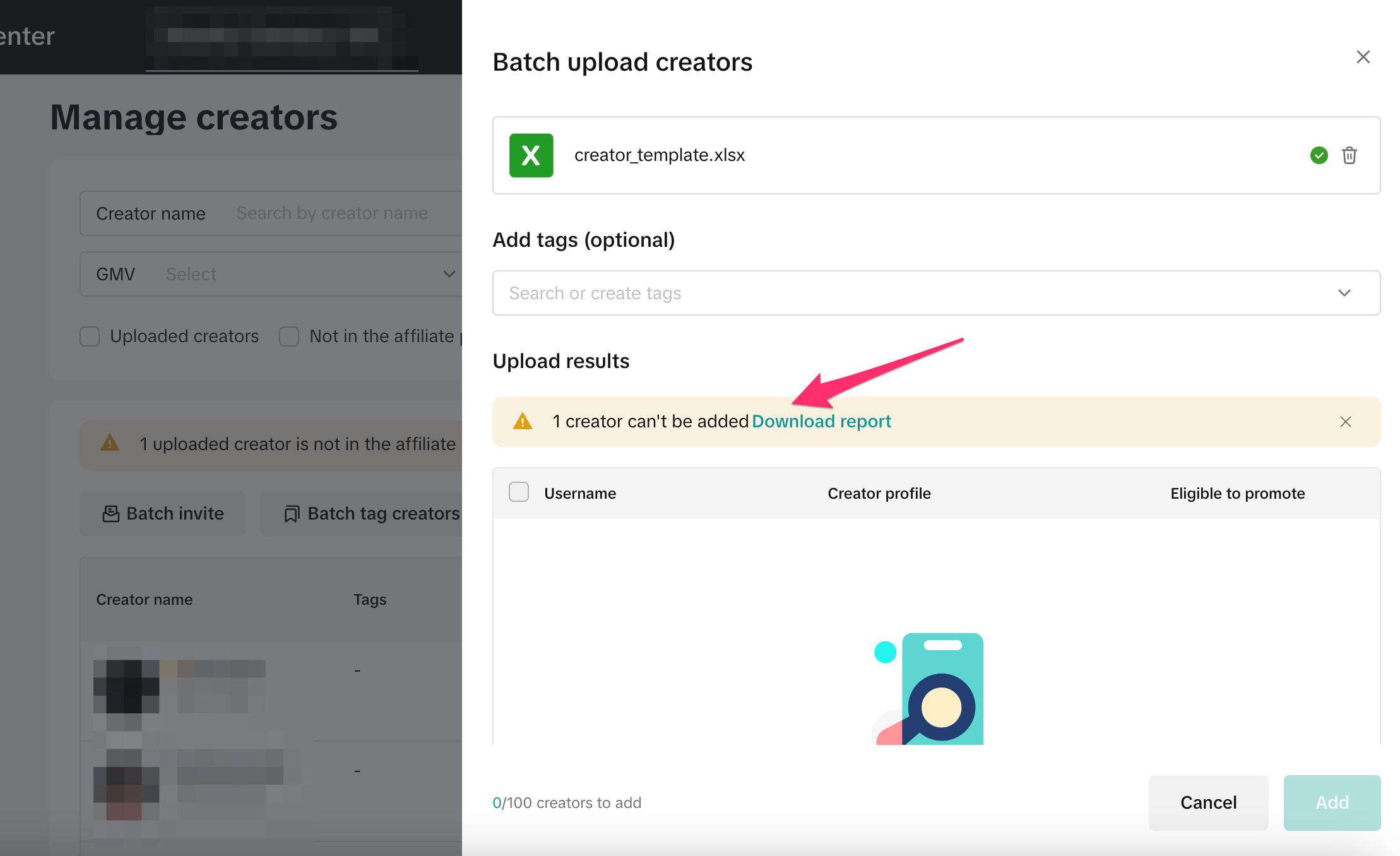 - 上传后,您将看到已导入的达人列表以及他们是否有资格在 TikTok Shop上推广产品。如果某个达人无法导入,您会看到带有「下载报告」链接的通知,该报告将说明原因。