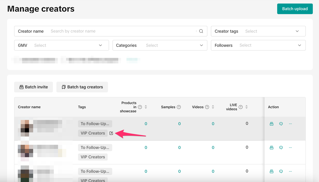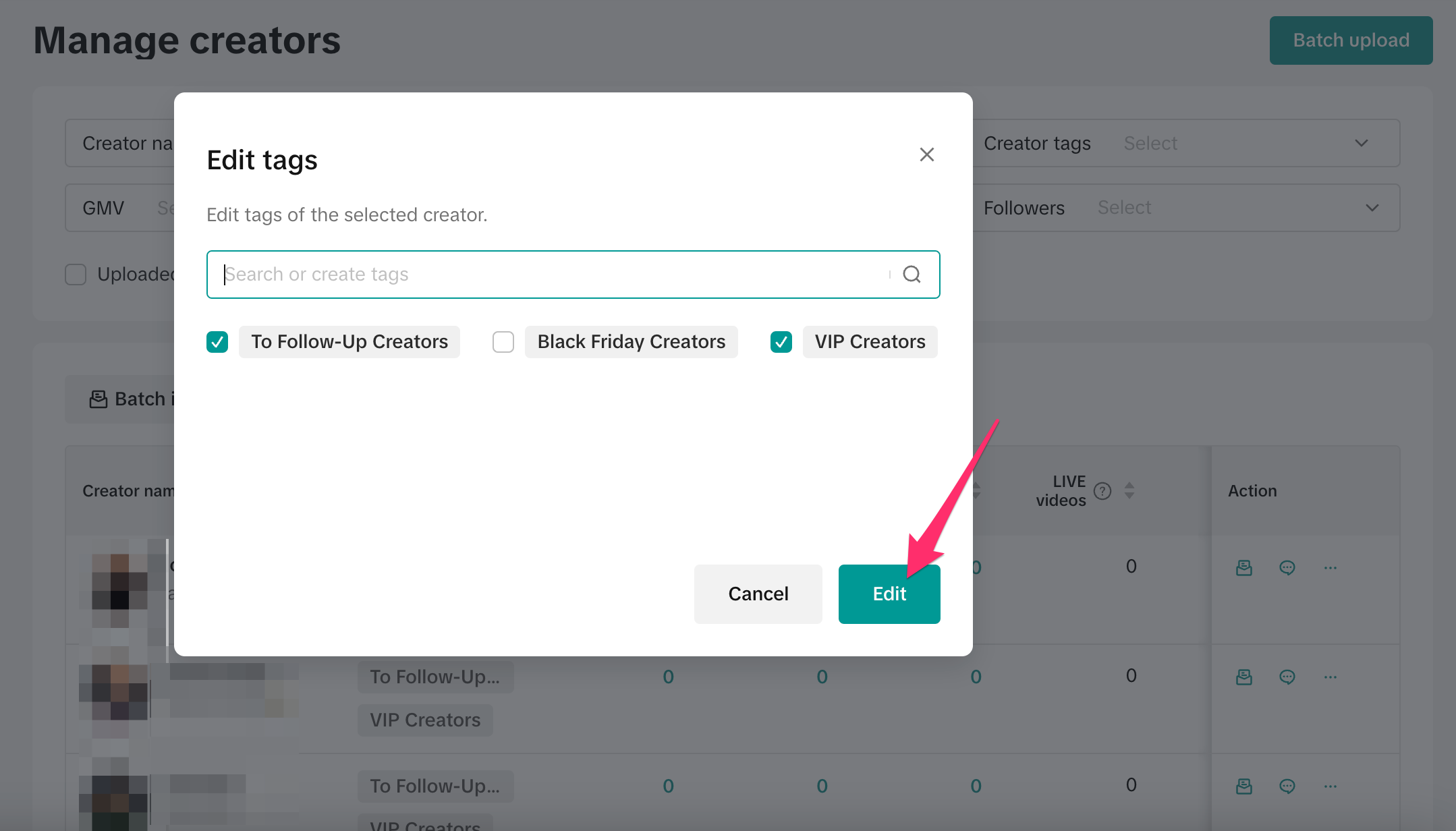 第 5 步: 使用「编辑」按钮为达人添加新标签。您可以通过点击「批量标记达人」,选择相关达人,然后点击「批量添加标签」来一次为多位达人打标。您也可以通过按「批量删除标签」来批量删除标签。