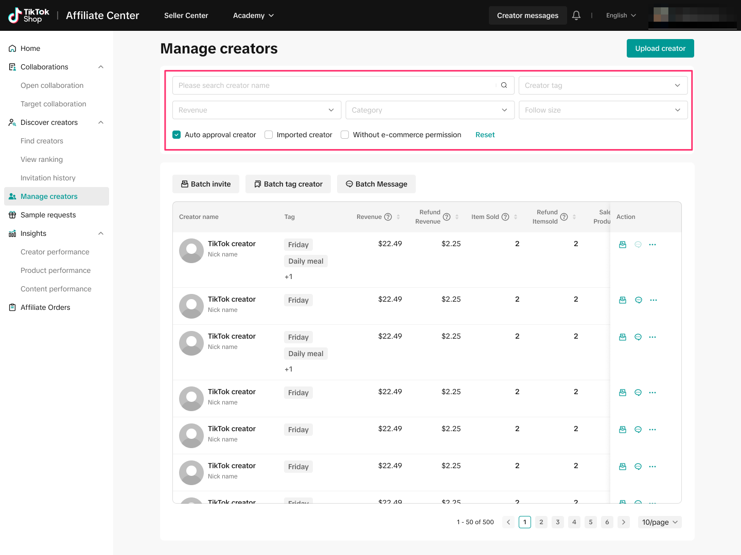 第 3 步: 要搜索特定达人,您可以使用顶部的筛选器,包括: