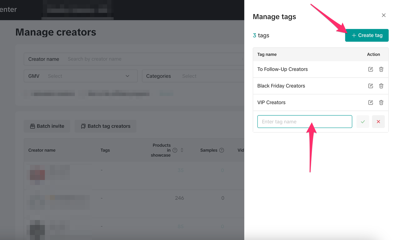 第 4 步: 要创建新标签,请点击「达人标签」筛选器并选择「创建新标签」。接着,点击「创建标签」。所有标签将显示在此处,并可进行编辑或删除。您最多可以创建 100 个标签,并且最多可以为一位达人添加 10 个标签。
