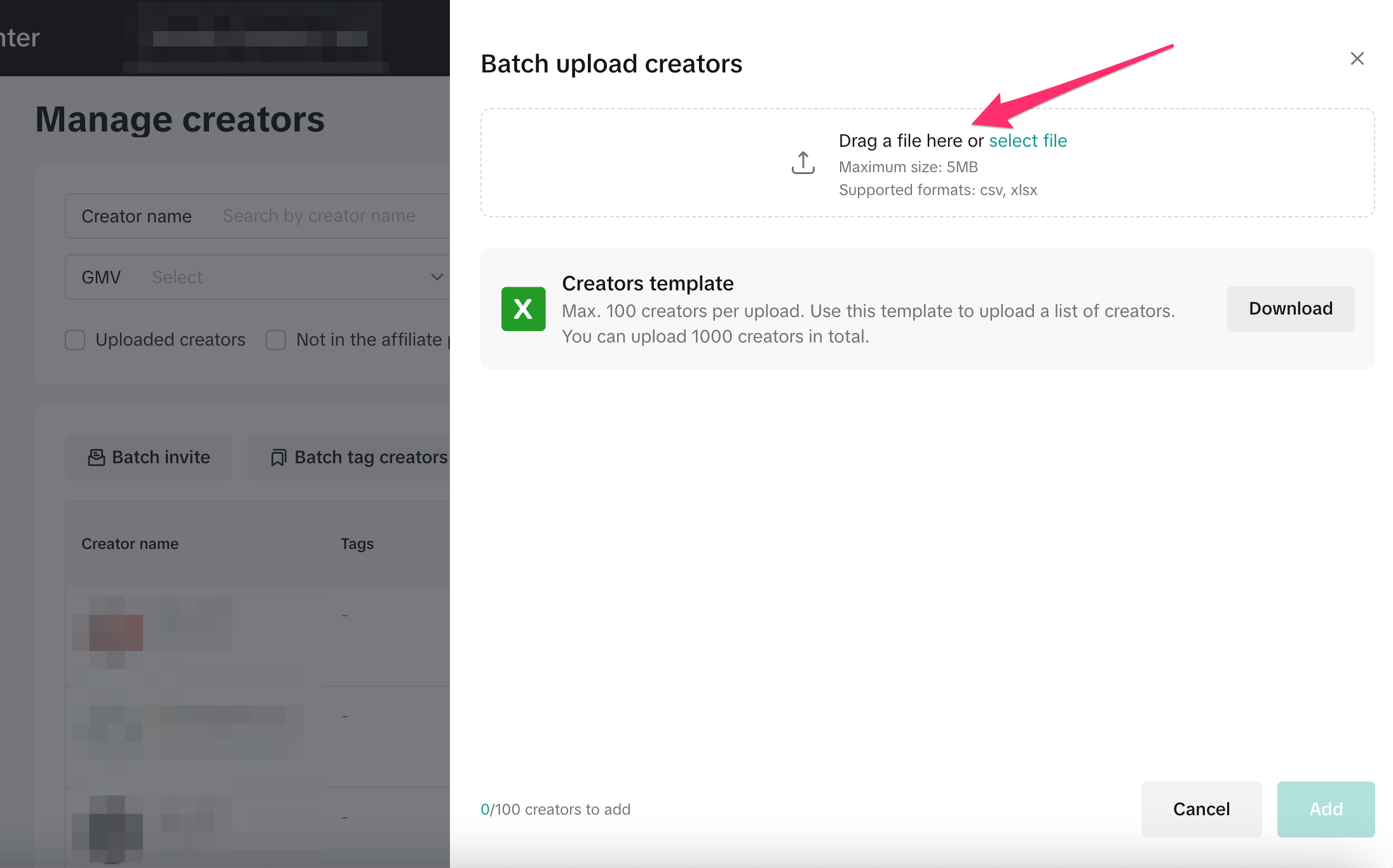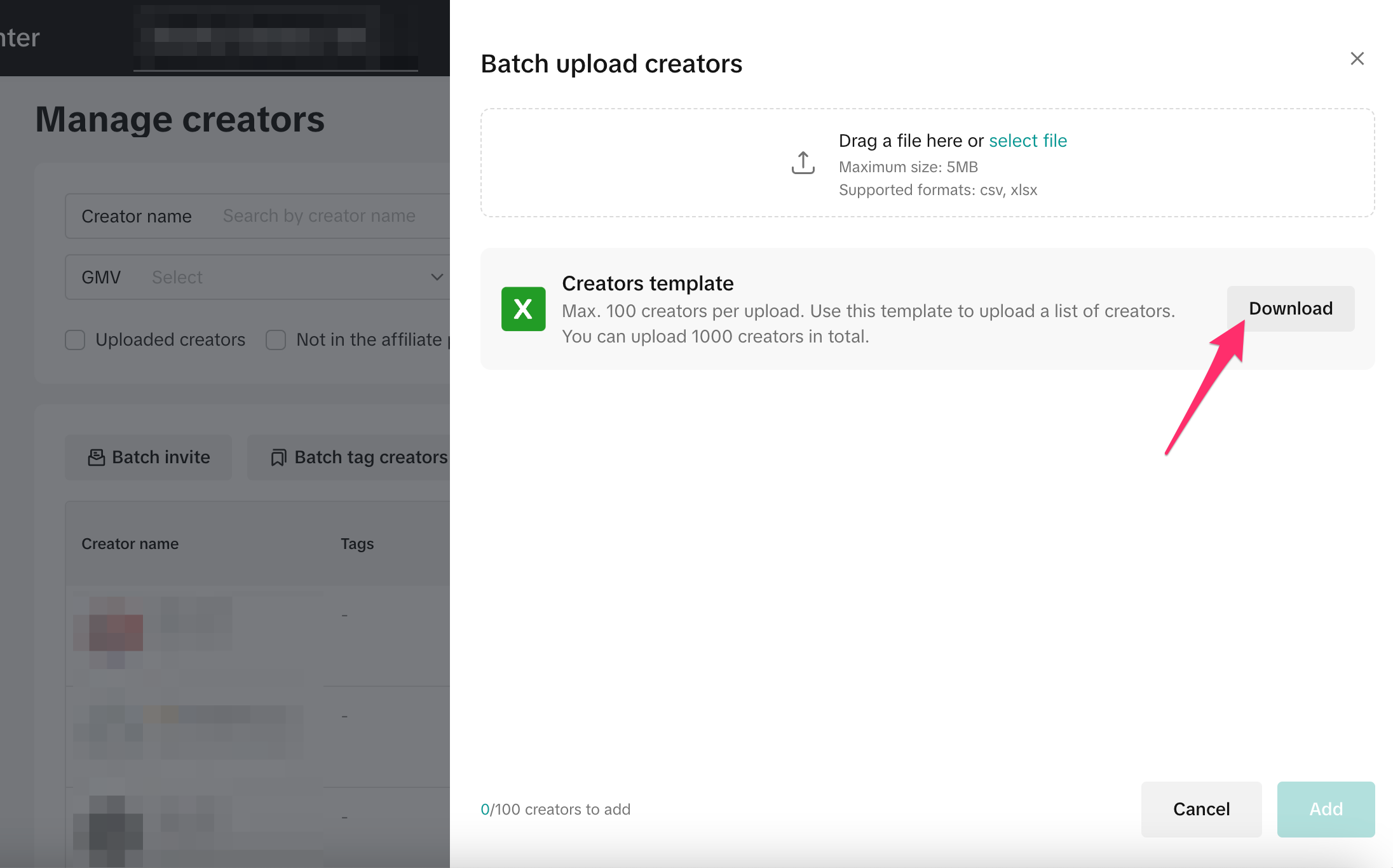 下载 Excel 模板,并添加您想导入的达人的用户名。请确保遵循 Excel 中注明的格式。