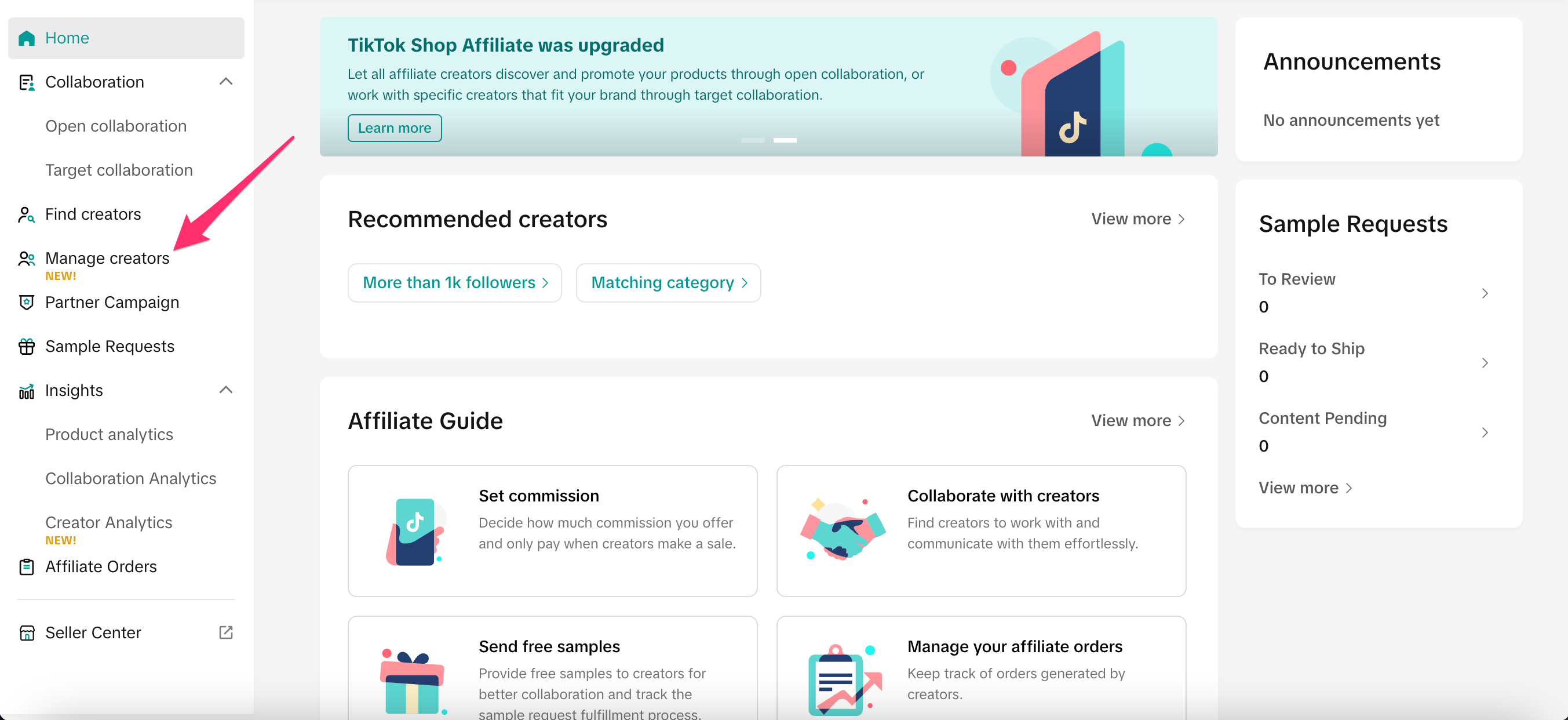 如何使用「达人管理」第 1 步: 在 TikTok Shop Affiliate Center 中导航至「达人管理」。