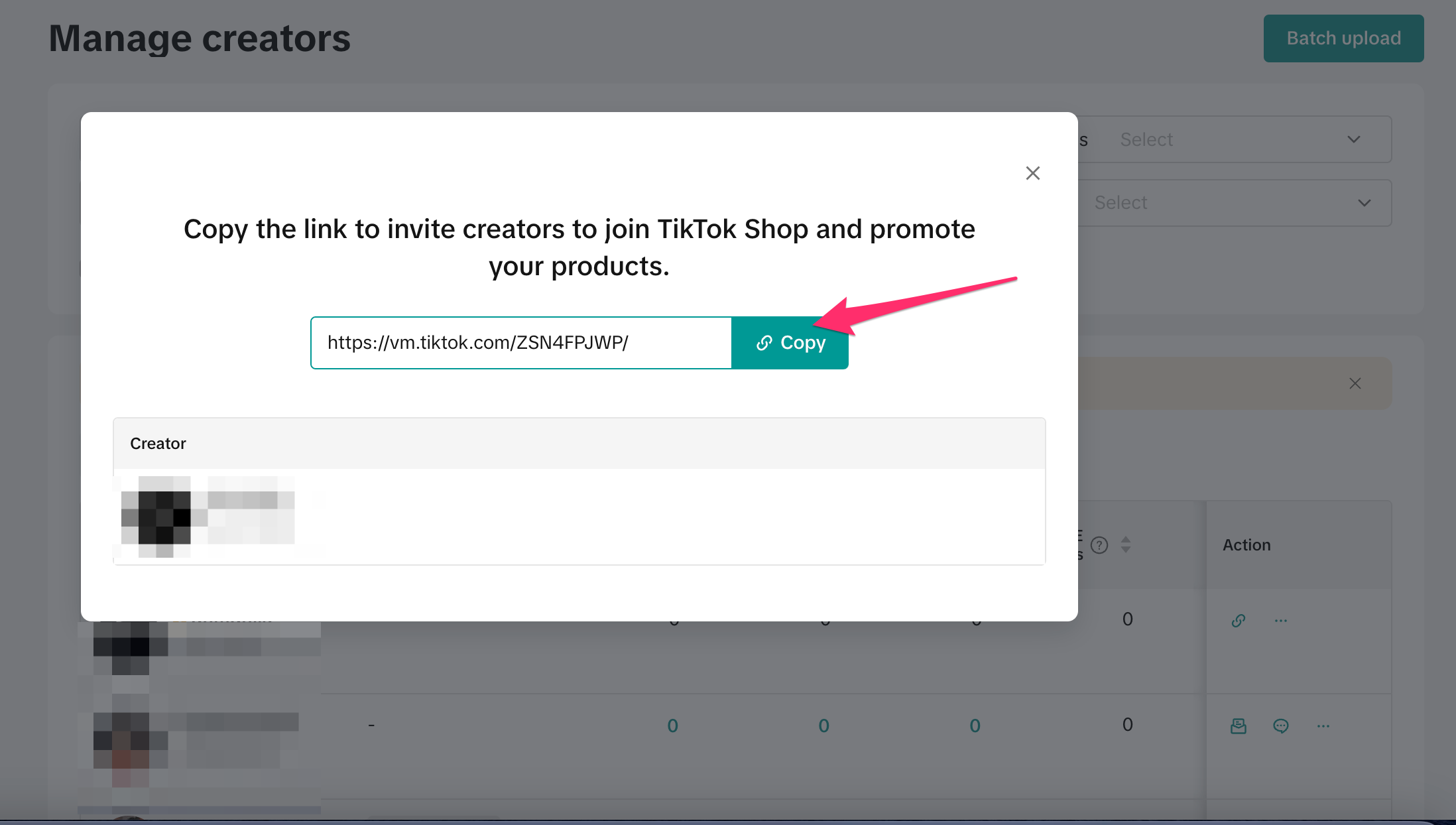 生成链接,邀请尚未加入 TikTok Shop的达人加入联盟计划。