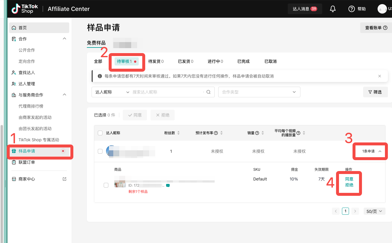 | 1. 进入“样品申请”页面,点击“待审核”tab,点开达人右侧的“N条申请”,点击同意或者拒绝即可。 | ![]() ![]() |