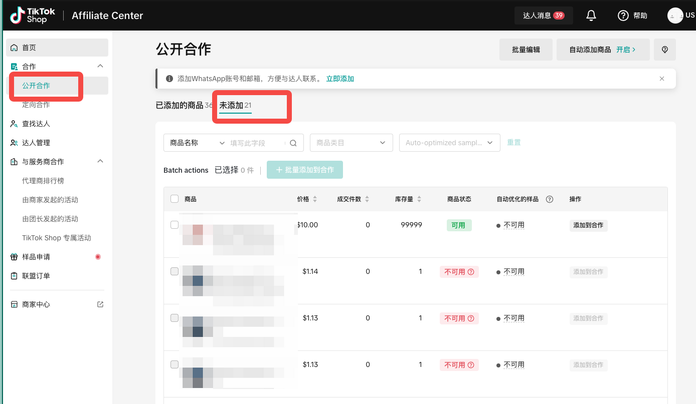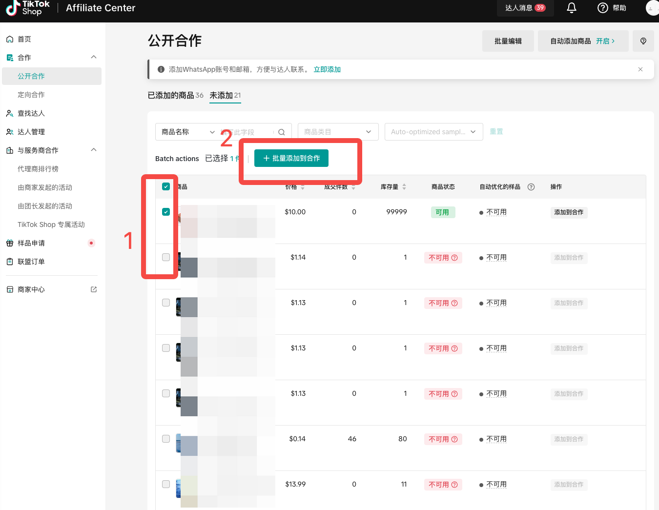 | 2. 选择你希望设置公开合作及免费样品的商品(商品必须有公开合作才能设置样品),然后点击“批量添加到合作” | ![]() ![]() |