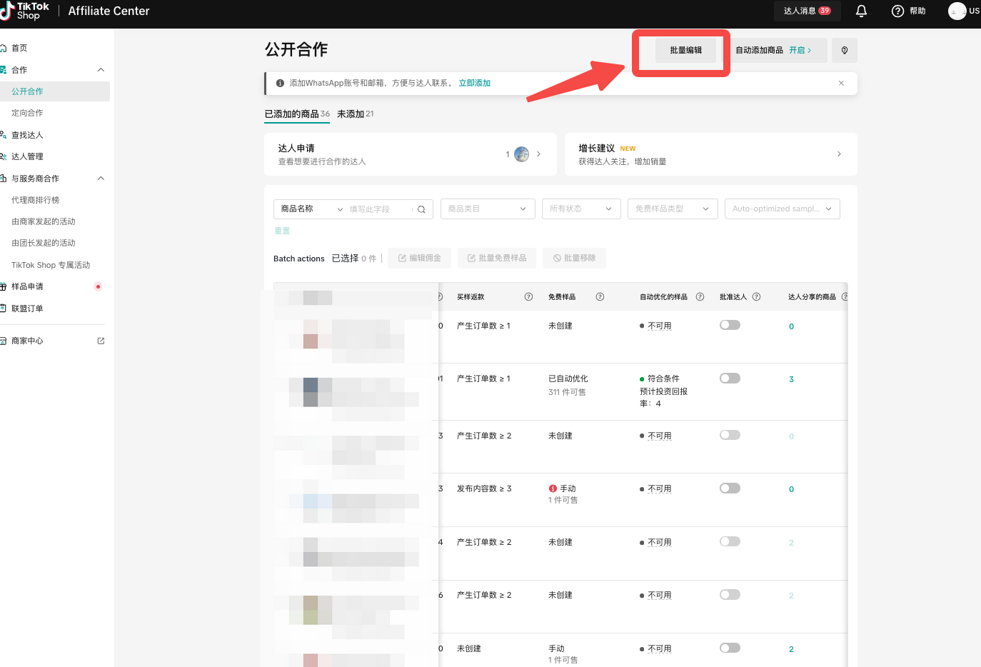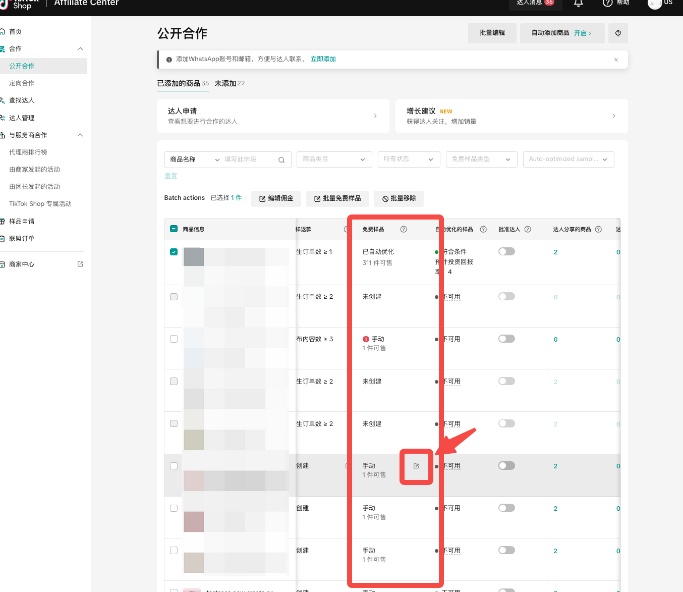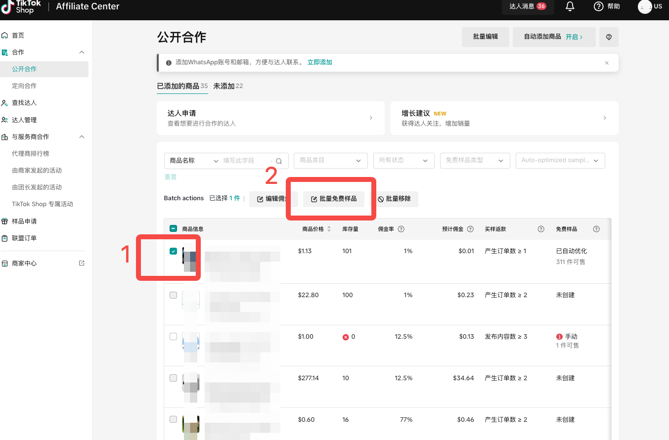 | 1.a 进入联盟带货后台-公开合作页面,勾选希望修改的商品,点击“批量免费样品”按钮 | ![]() ![]() |