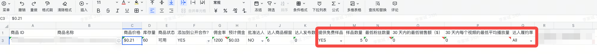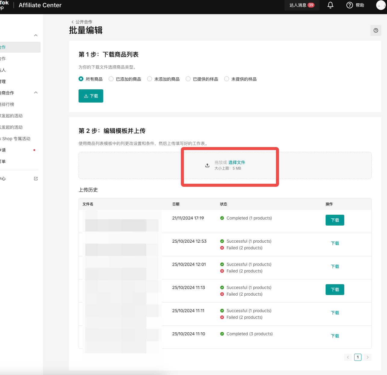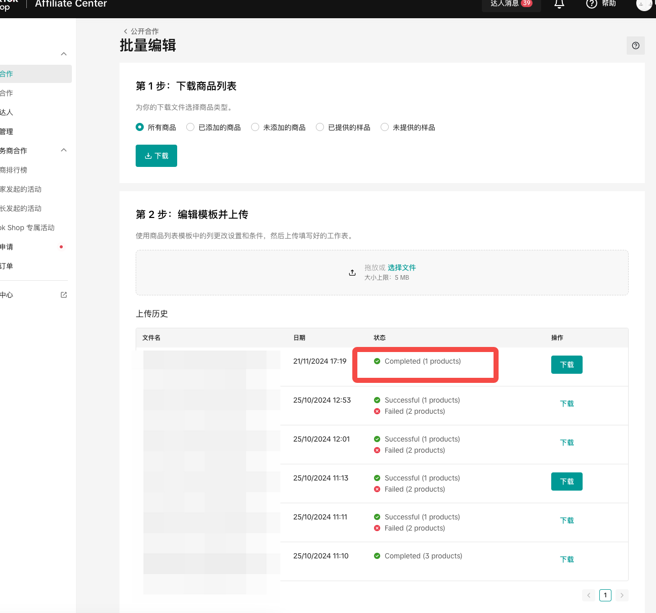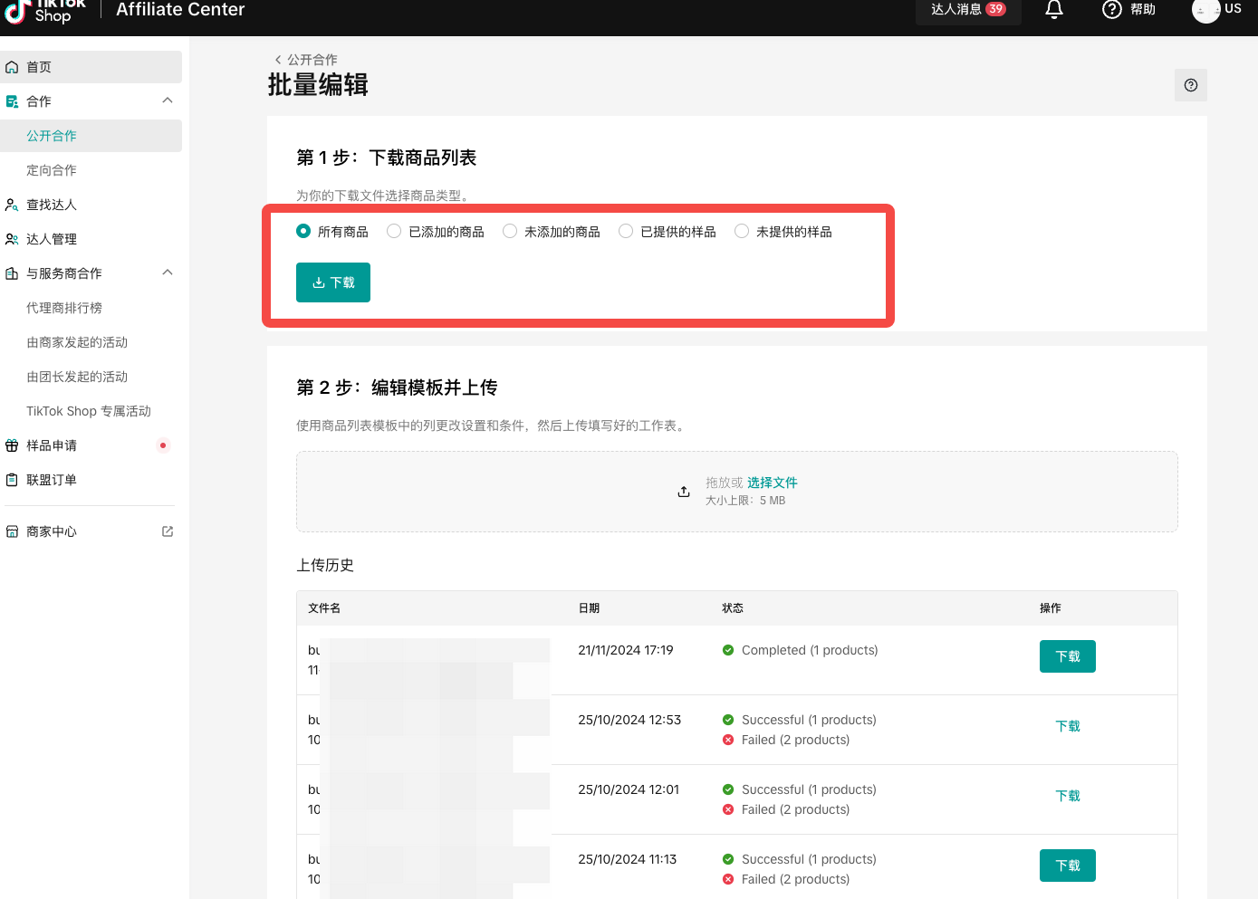 | 2. 下载一个文件模板,你可以从“所有商品”,“已添加到公开合作的商品”,“未添加到公开合作的商品”,“已提供样品”,“未提供样品”中选择一个 | ![]() ![]() |