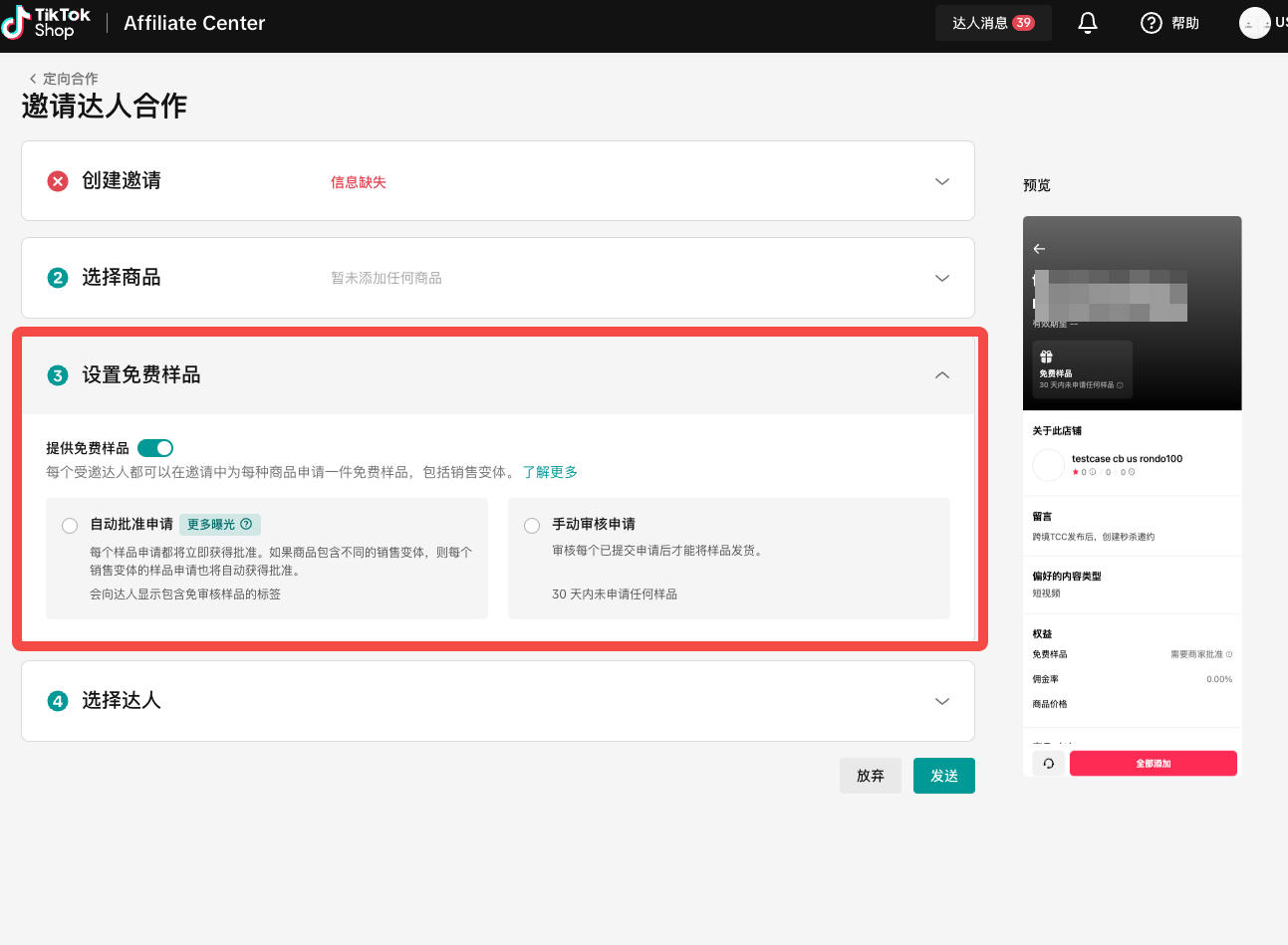 | 在创建定向合作页面中第三步“设置免费样品”中将“提供免费样品”按钮打开,并选择“自动批准申请”或“手动审核申请。 – 建议选择自动批准申请获得更多曝光! | ![]() ![]() |