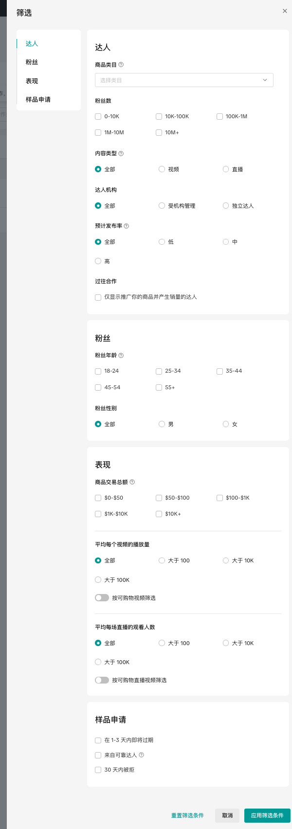 如果商家没有设置门槛,那么所有拥有TikTok Shop电商带货权限的任何达人都可以申请免费样品。如果商家设置了门槛,那么只有符合门槛的达人可以申请。