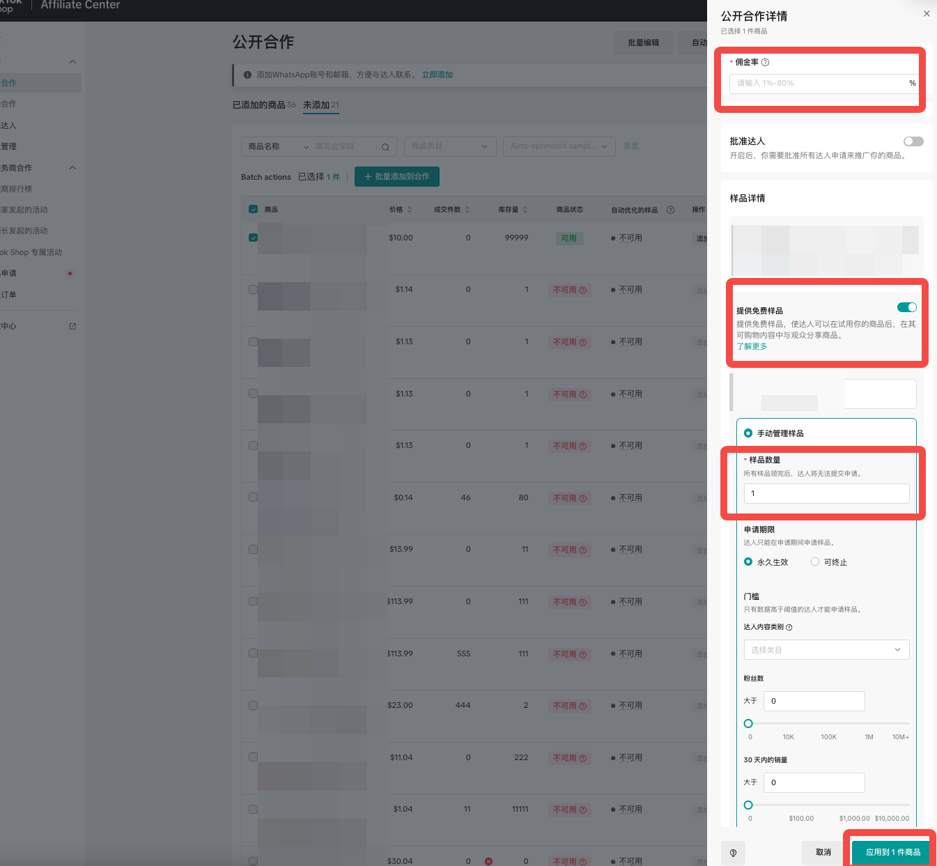 | 3. 在弹窗中填写佣金率、开启“提供免费样品”的按钮,输入样品数量、申请期限、达人门槛,点击右下方“应用到N件商品”即可。 – 门槛建议不设置。 | ![]() ![]() |