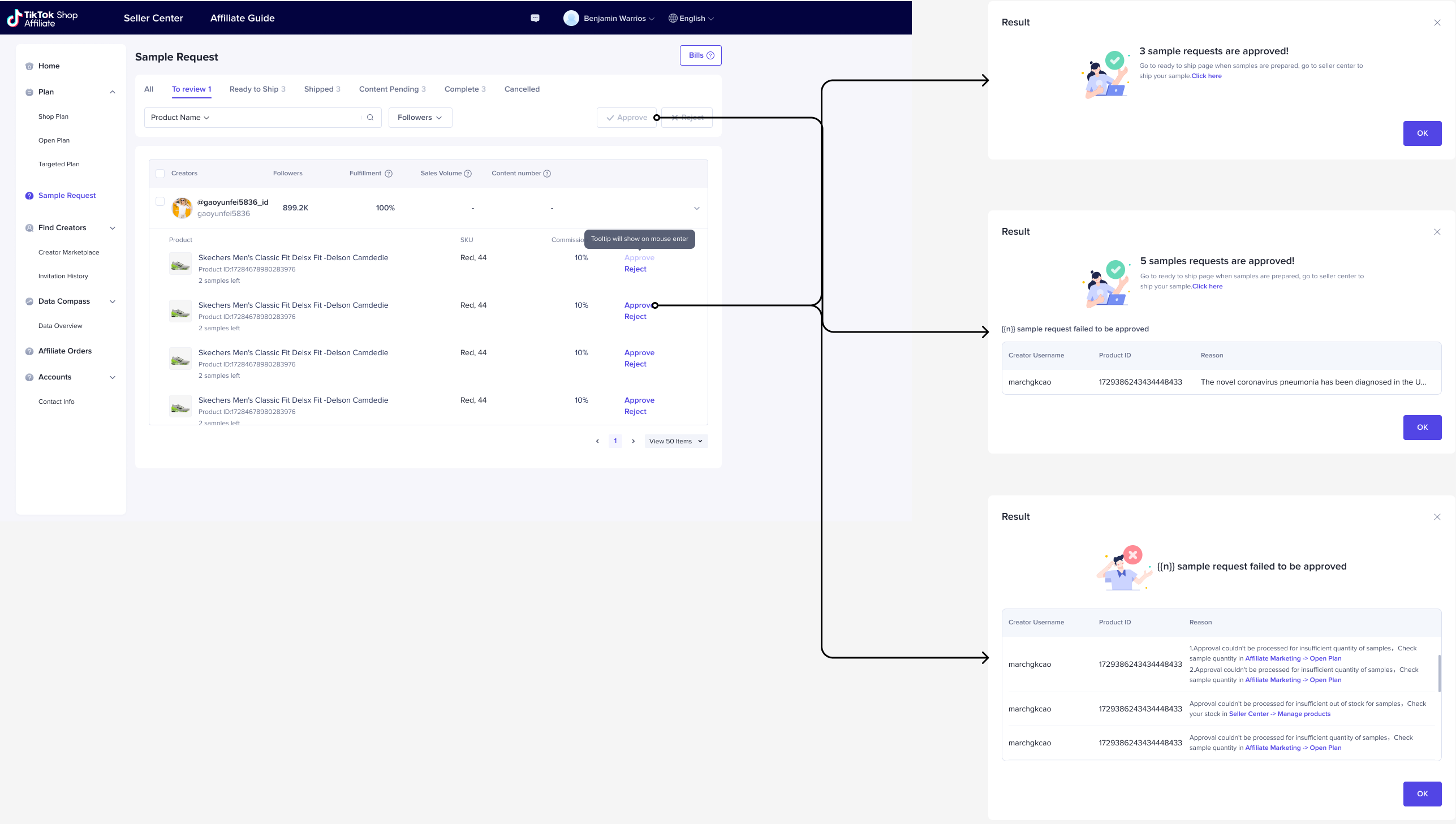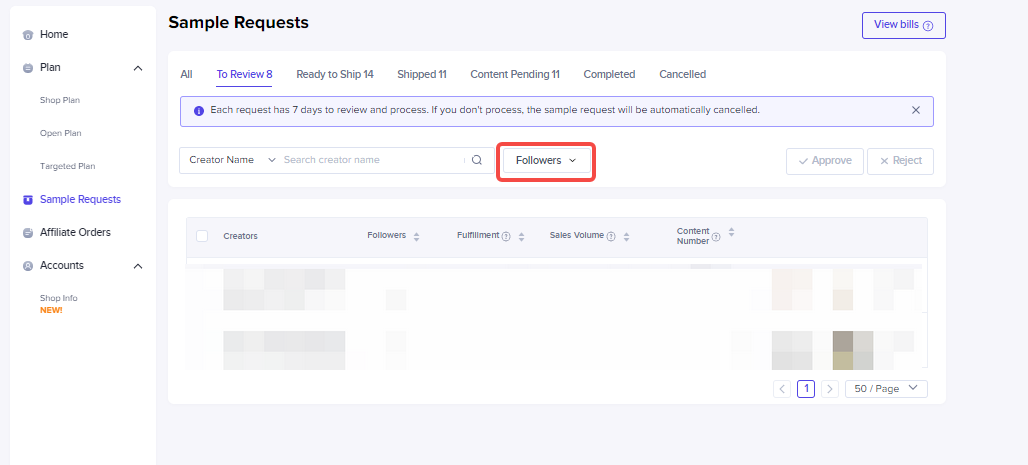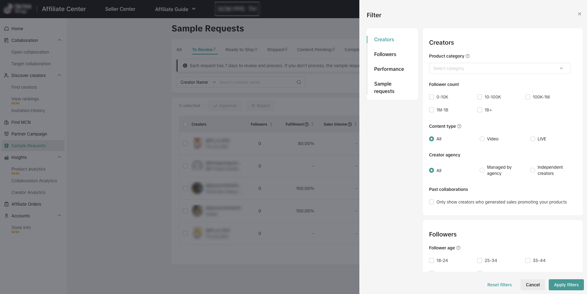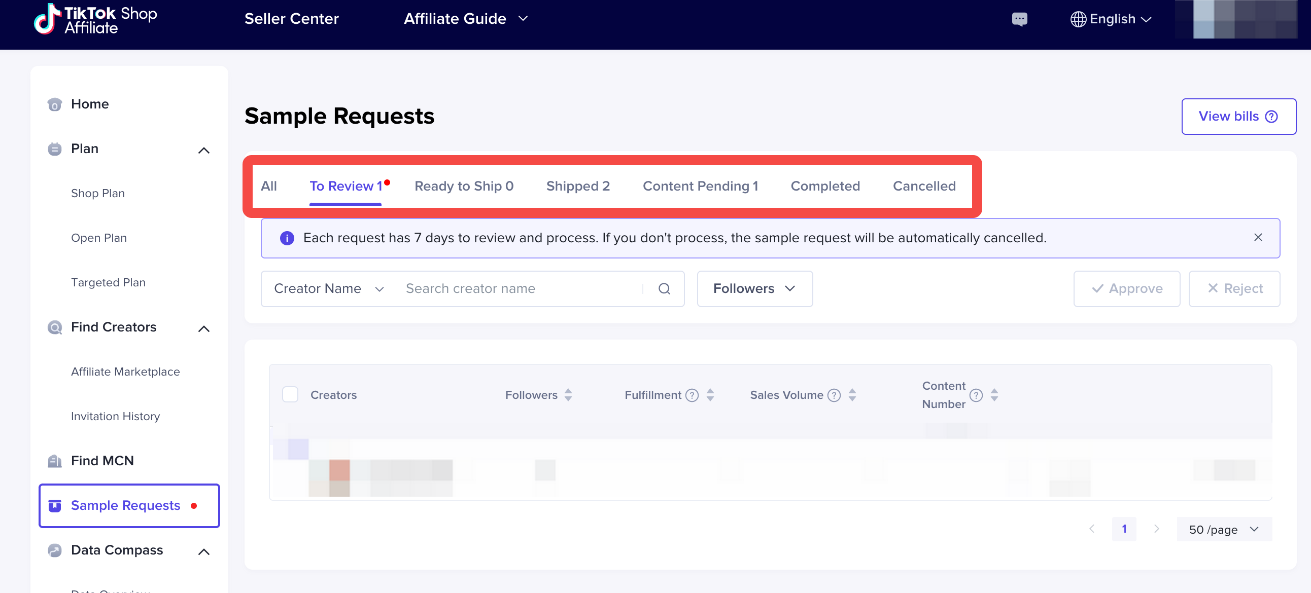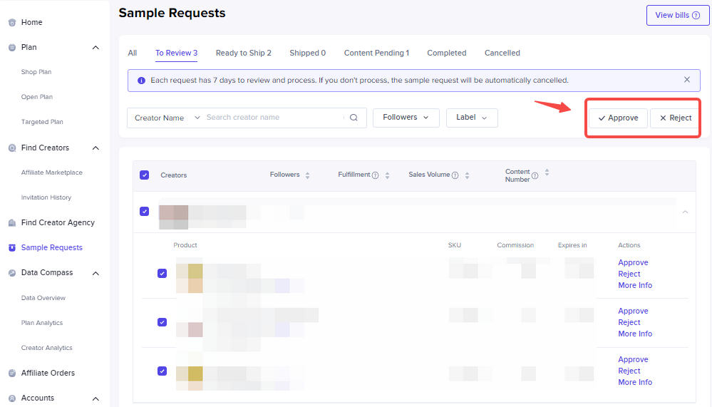 - “待审核”:包括所有要审核、同意或拒绝的申请。在此选项卡的审核部分中,商家可以查看达人的详细信息,包括名称、关注者人数及更多详细信息