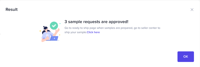 - 在该弹出窗口中,系统随后会提示商家前往商家中心进行样品发货。如需详细了解如何通过商家中心发货,请参阅相关用户指南。