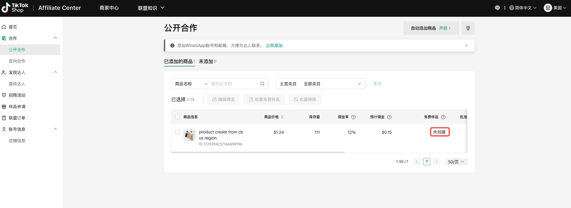 - 公开合作,进入联盟中心,单击公开合作,选择您想要提供的产品。然后打开“提供免费样品”开关,选择样品数量、您希望允许样品请求的时间以及达人门槛。