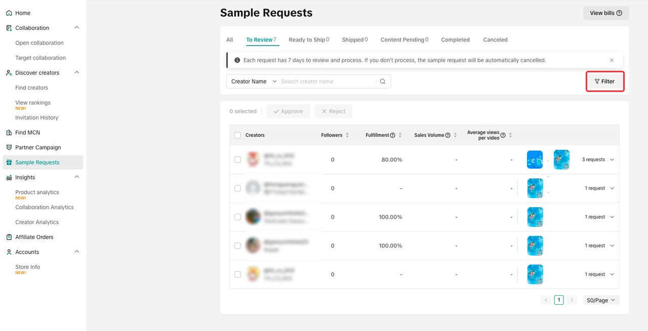 在达人填写免费样品申请后,商家会在联盟中心内收到所有要管理的申请:
