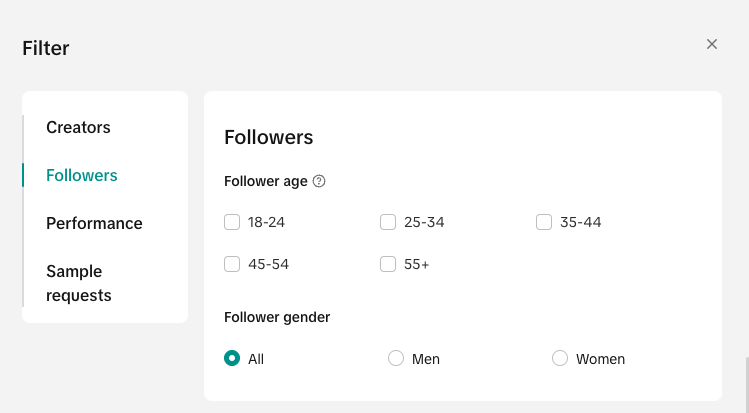 - 粉丝年龄:根据达人的粉丝年龄范围进行筛选。选择后,筛选器会将粉丝数最多的达人置于列表顶部。