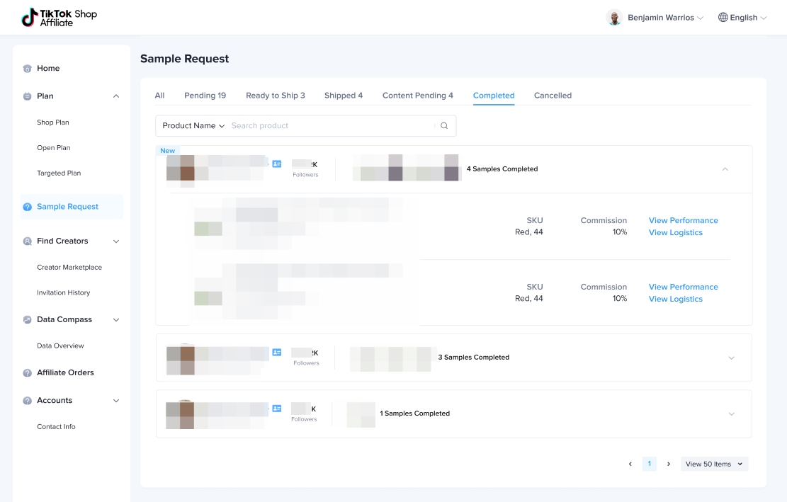 轻松进行样品管理:管理和跟踪整个免费样品历程,包括样品发布、达人申请、样品履约、内容跟踪以及达人和内容表现。