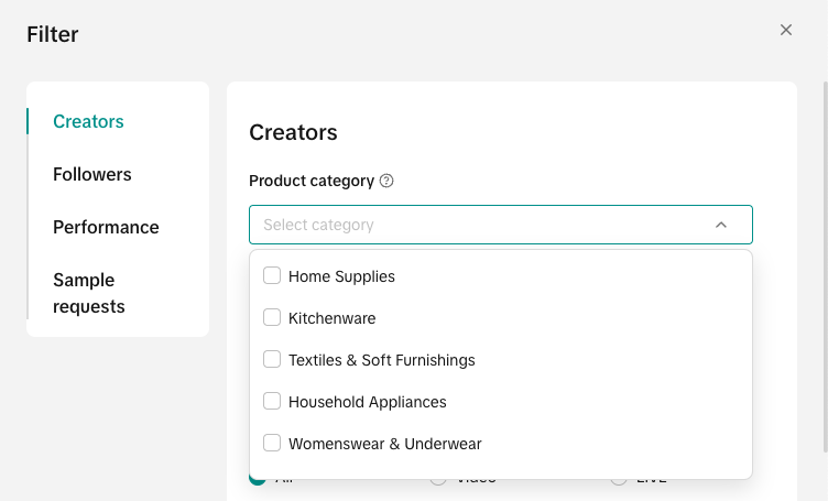 内容类型:该选项可筛选出过去30天内使用视频、直播(或两者)推广商品的达人。