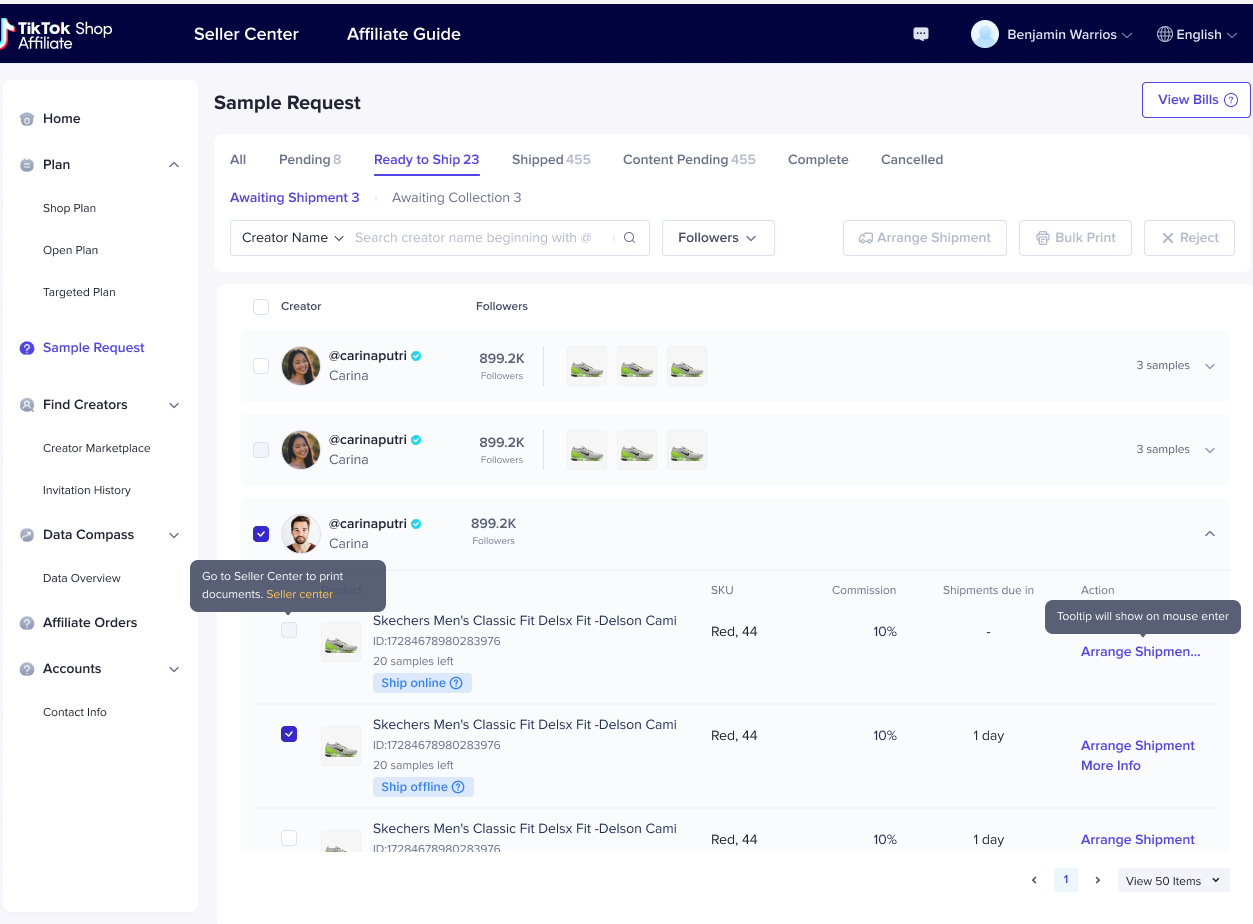 商家可以通过免费样品功能向达人寄送赠品,方便他们创作更具吸引力的内容来帮助更快地提升销量。利用此功能,商家还可以管理和跟踪整个免费样品历程,执行样品管理、同意和拒绝申请、进行样品发货、审核并跟踪随样品发布的内容等操作。
