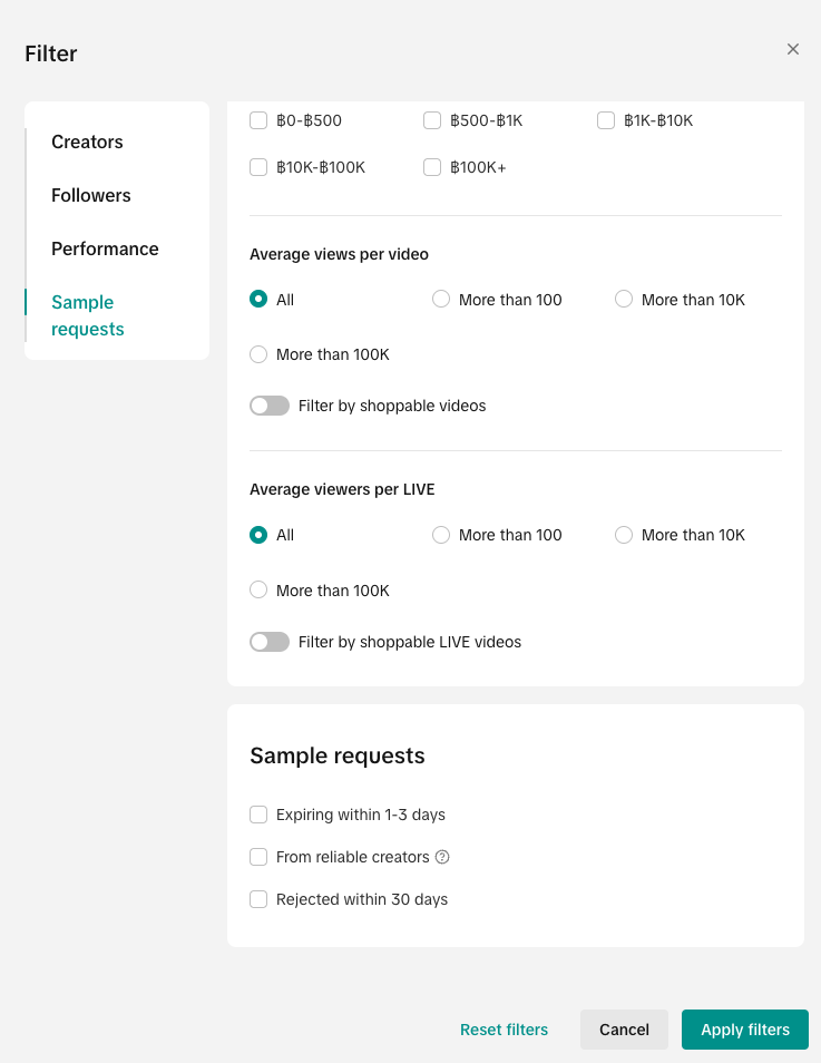 在表现选项下,您可以根据达人的创收情况、视频观看量和每场直播观看人数进行筛选: