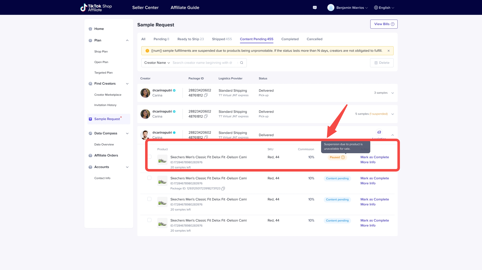 在其他情况下,达人可能会因为以下原因而无法履行样品申请并且其履约申请会被暂停: