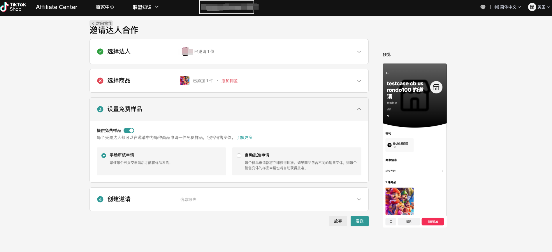 - 定向合作:进入联盟中心,点击定向合作,在定向合作创建过程中,开启免费样品按钮,并且选择是否要手动或者自动同意达人的样品申请