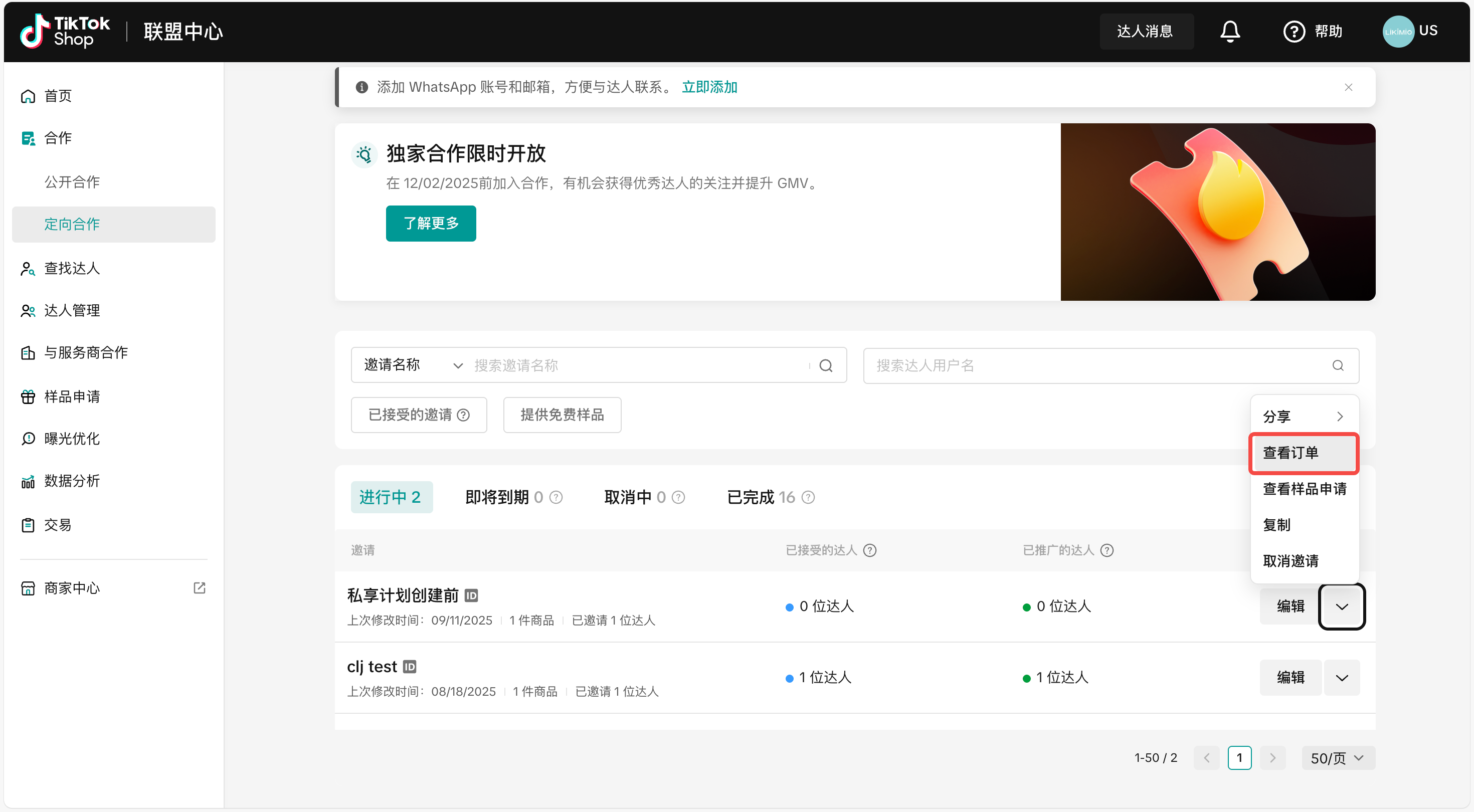 在”定向邀请管理”页面查看效果:联盟中心 → 定向合作 → 进行中 → 操作 → 查看。