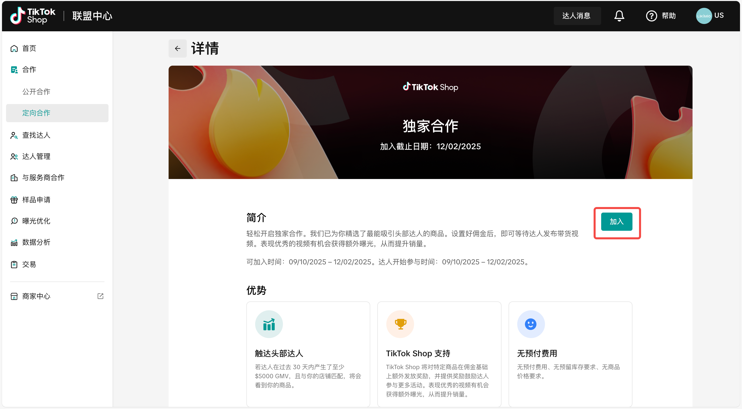 在联盟中心的”定向合作”页面,通过选择时间范围、确认产品、设置佣金率和定义样品策略来设置您的计划。