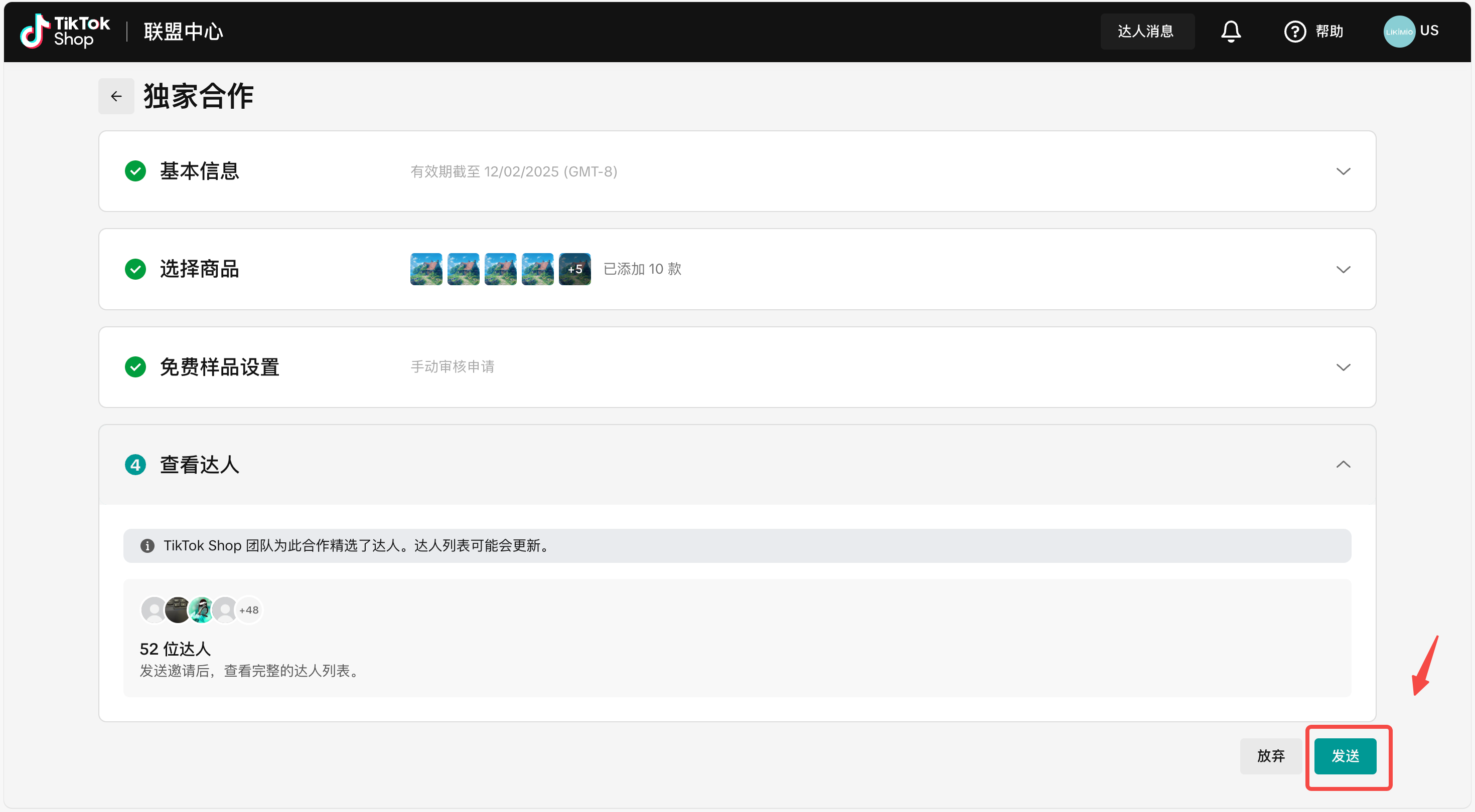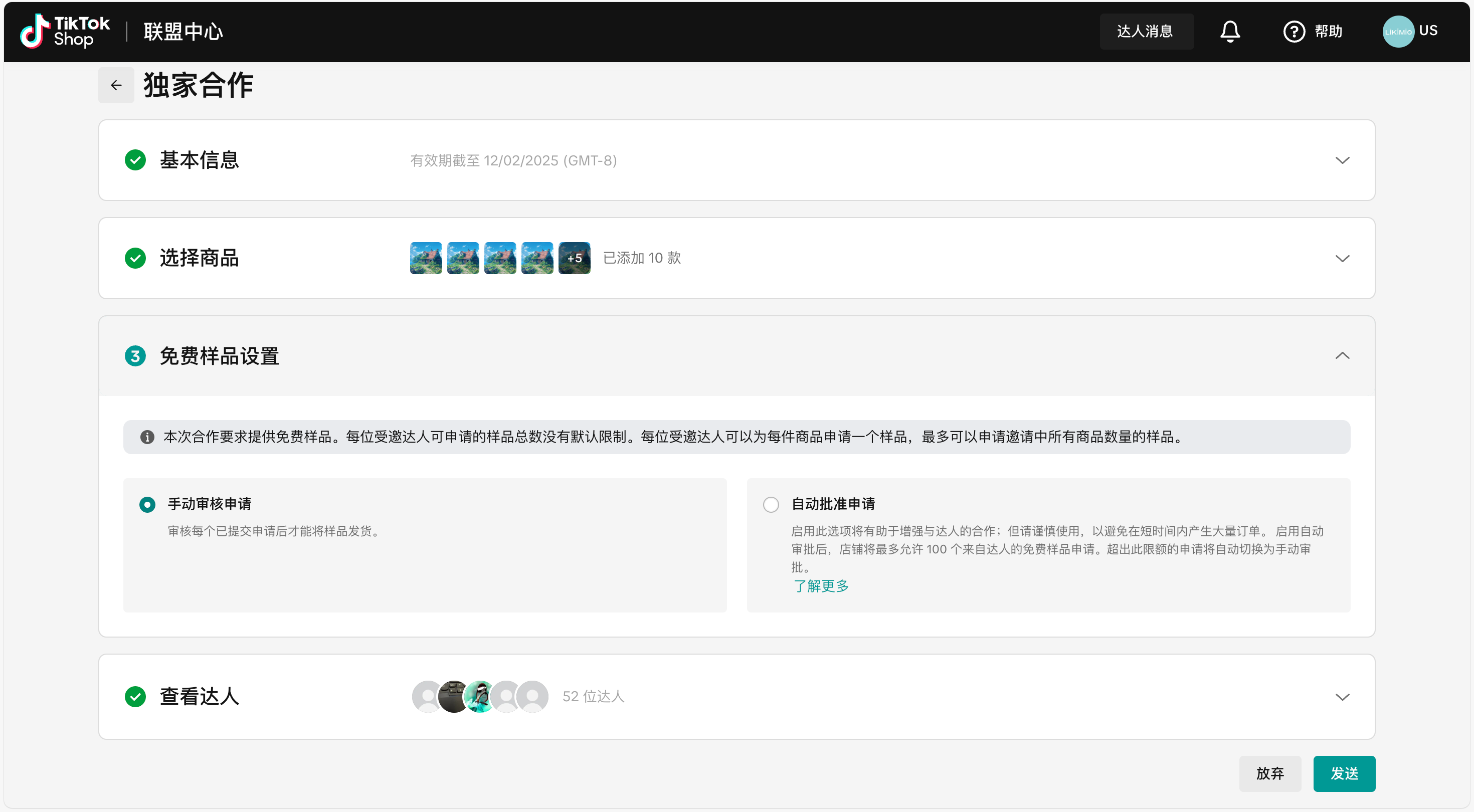 - 发送合作:完成商品选择与样品设置后,点击”发送”即可发布合作邀请