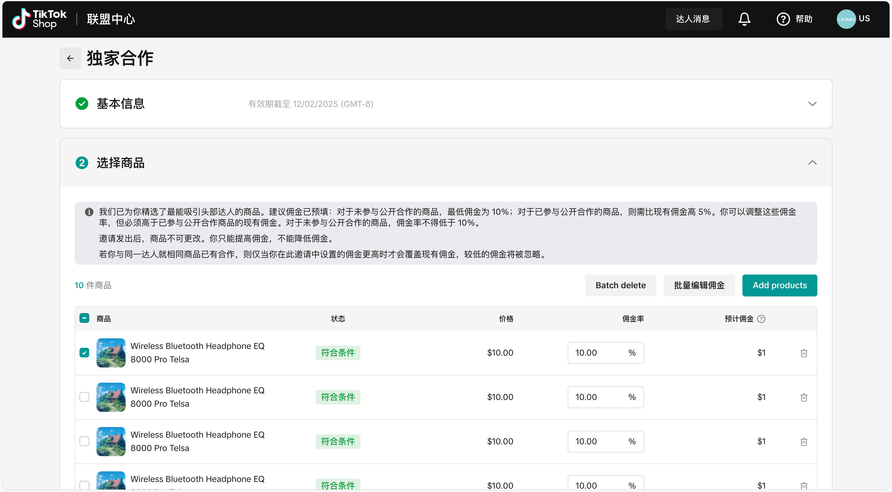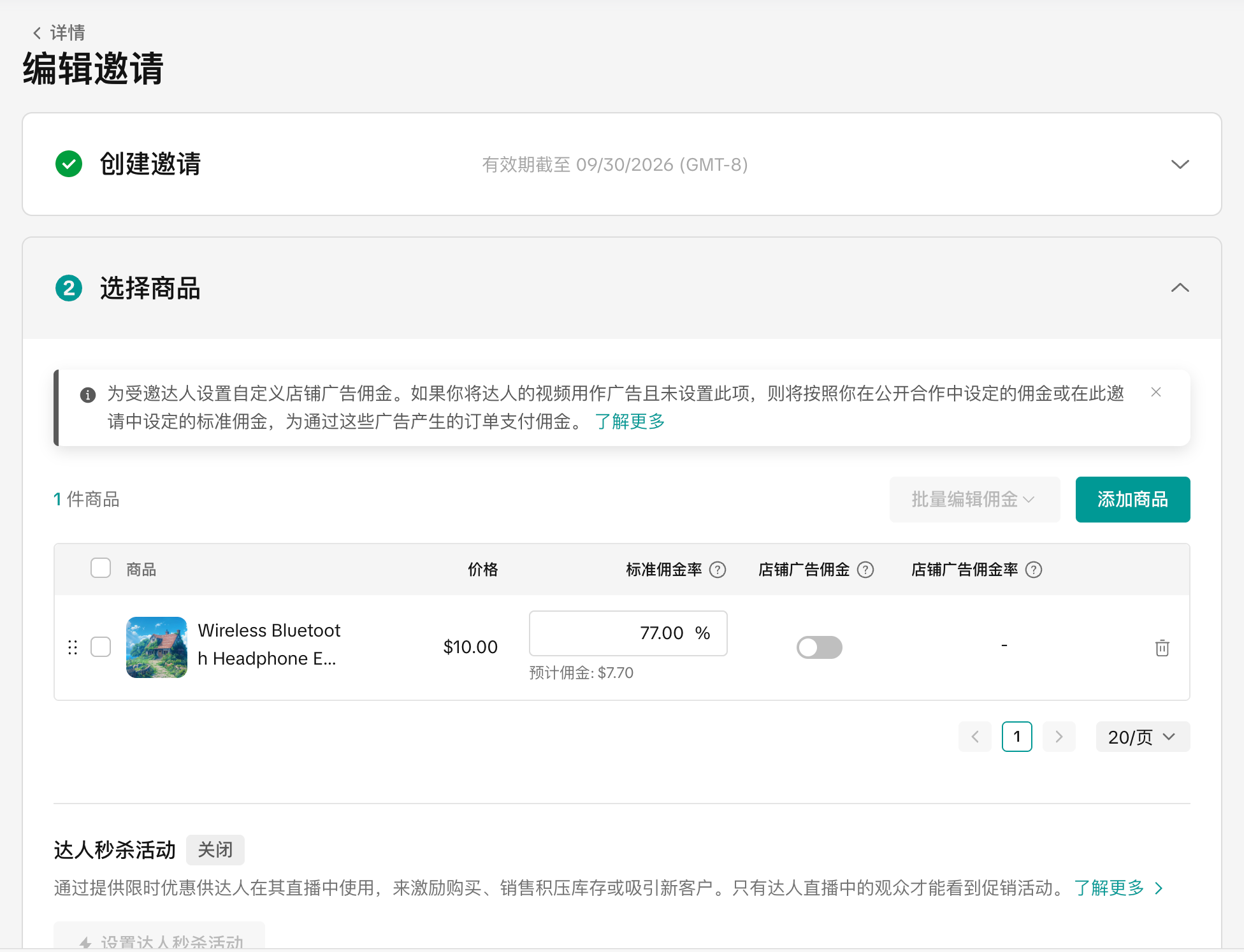 为每款产品设置的佣金率应高于或等于您的”公开合作”佣金率。对于未加入公开计划的产品,至少设置为10%。佣金必须始终达到或超过任何现有的”公开合作”佣金率,以有效激励顶尖达人。