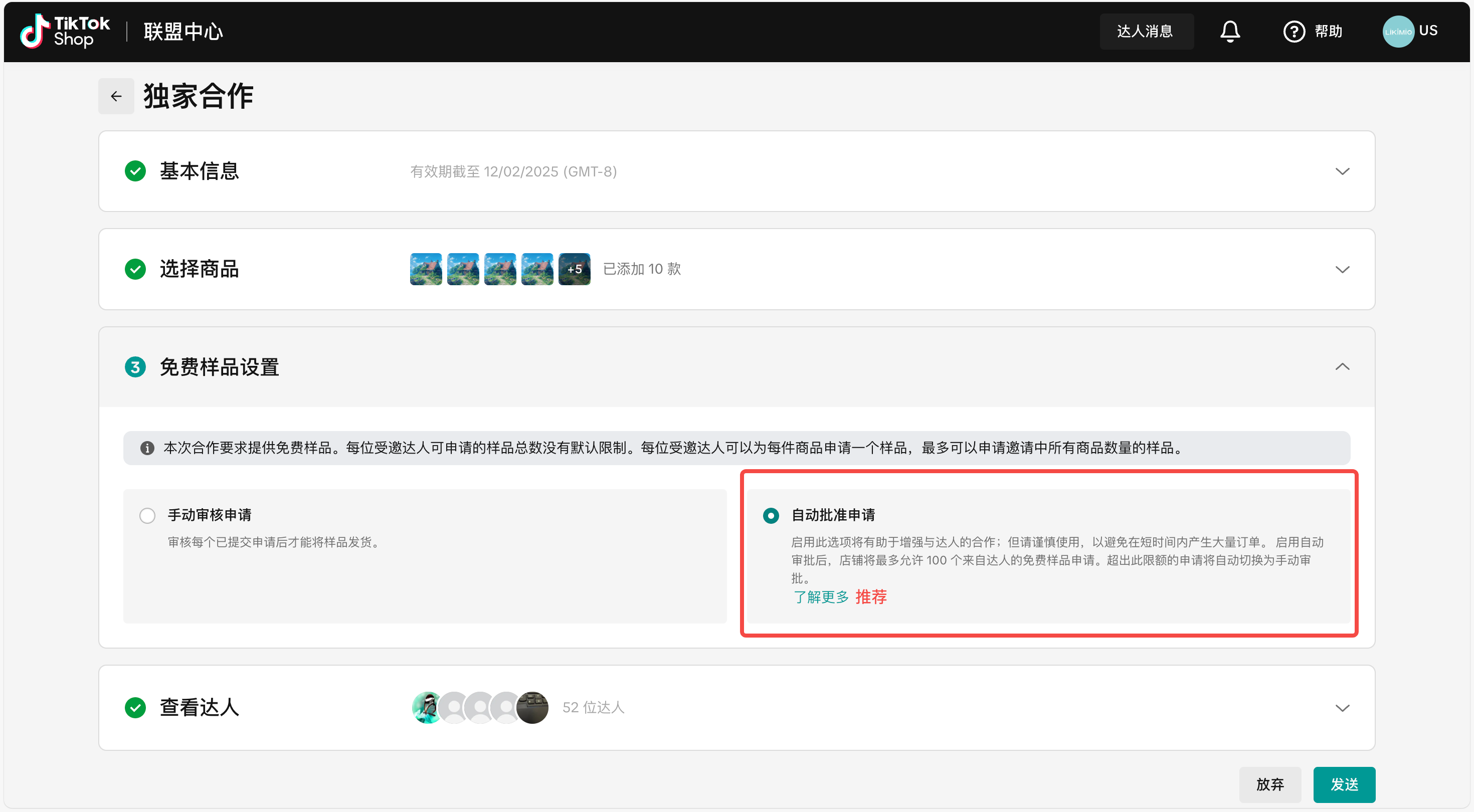 是的,为确保达人能够制作高质量、真实的内容,免费样品申请是参与私享计划计划的必要部分。您可以为匹配的达人选择”自动批准”或”手动批准”样品请求。