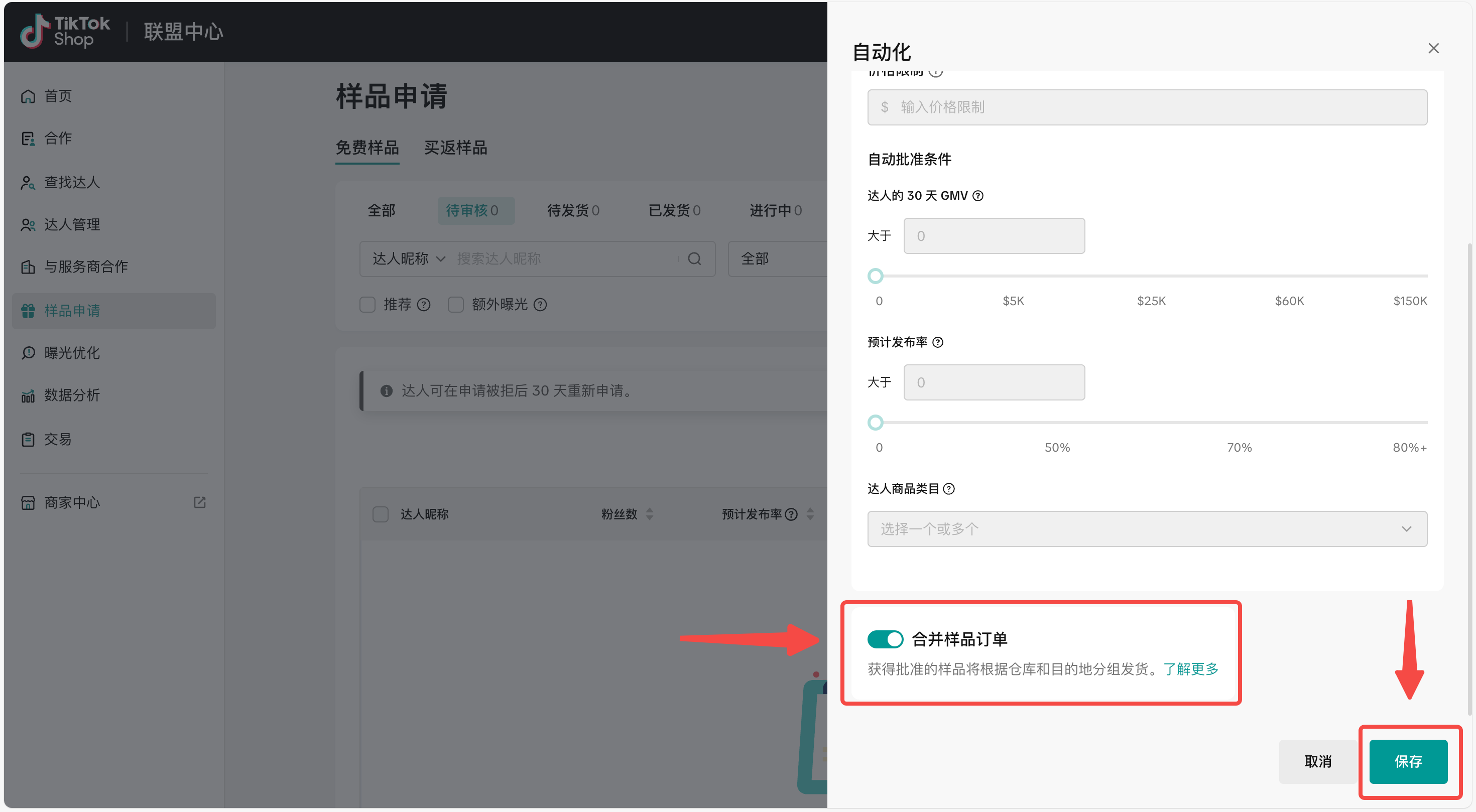 - 此功能默认对所有卖家开启。如需更改,可在”样品请求”页面右上角找到”自动化”按钮,点击后在弹出的二级菜单中,滑至底部即可操作关闭/重新开启样品合单发货