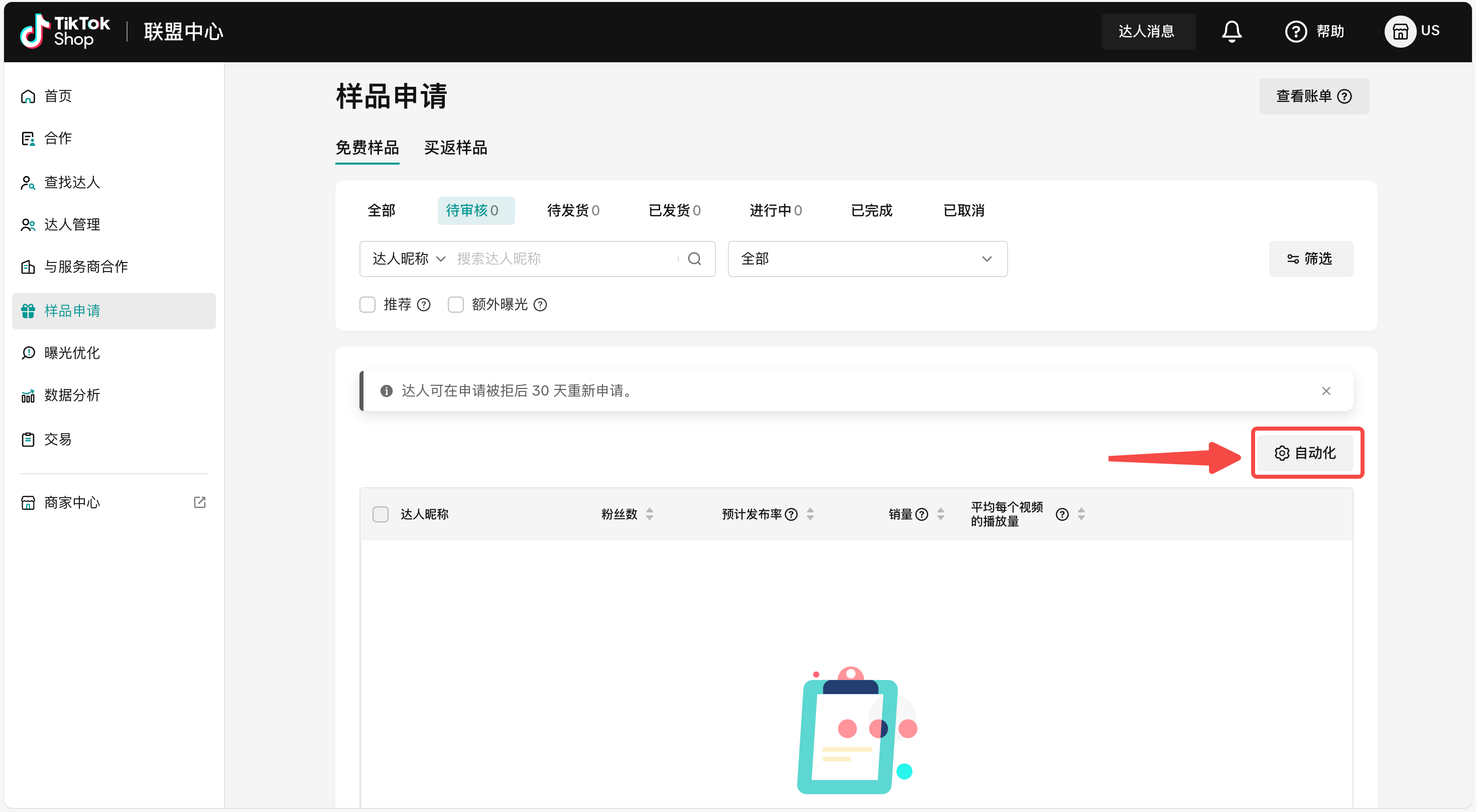 故障排除!在极少数情况下,例如产品缺货或出现新的达人违规,样品订单将不会合并,您会在样品请求页面上再次看到该请求。页面上会有相关提示,您也可以使用我们的筛选选项来识别这些”失败”的案例。