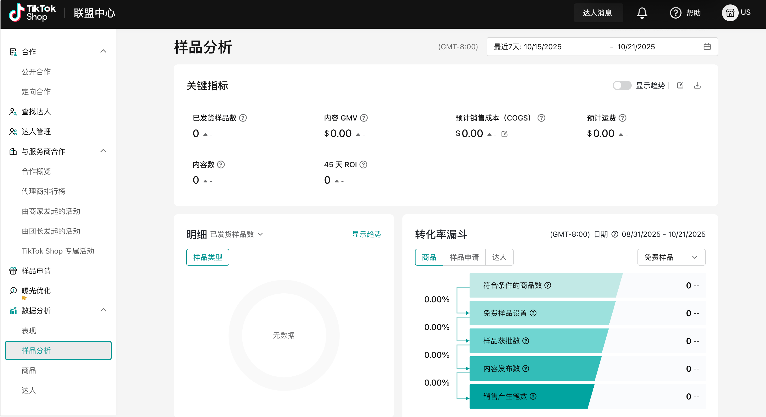 核心指标一览:页面顶部以卡片形式显示了关键指标,为您提供性能快照。这包括诸如”已发货样品总数”、”样品总GMV”、”预估样品销货成本”和”预估运费”等指标。
