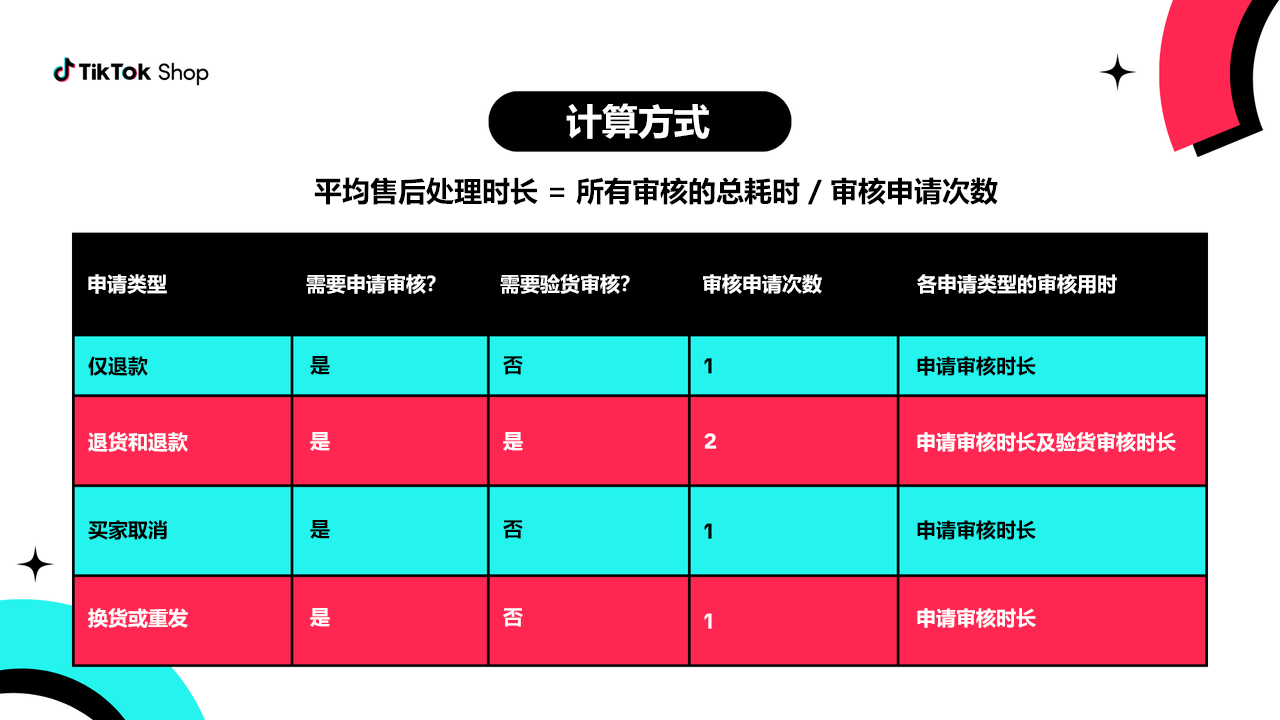 公式: 售后处理时长 = 等待商家处理的总耗时 / 总审核次数(申请审批次数 + 商品验收次数)