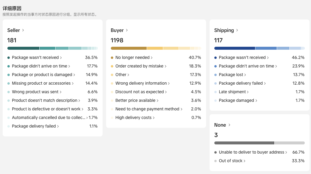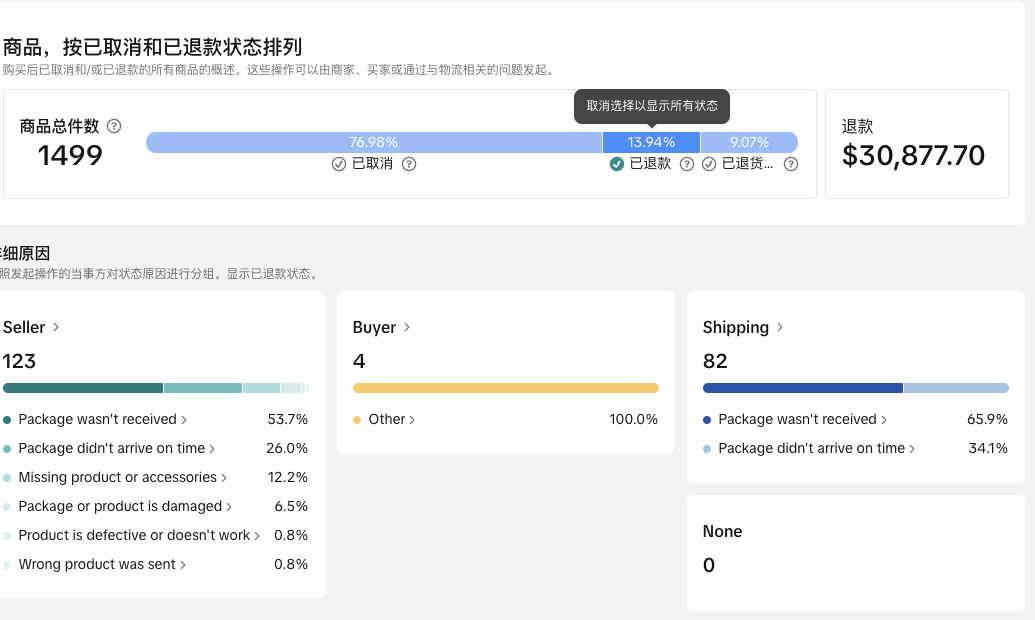 您还可以确定每个阶段取消和退款的责任,无论是由卖方、买方还是运输造成的。您还可以查看取消和退款的原因和贡献率,以找出主要问题。