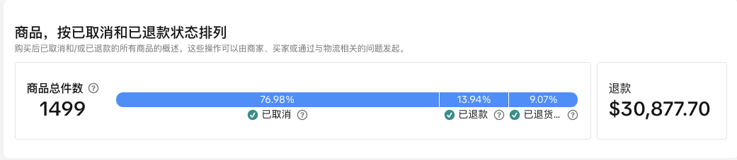 此功能使您可以清楚地了解已售商品的取消和退货分布,包括商品数量和退款。