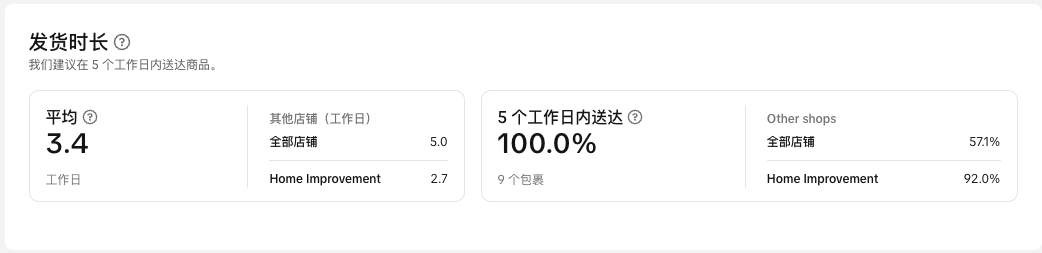 我们建议包裹应在 3 天内发货并在 5 天内送达。此功能显示有多少软件包满足此要求,以及行业同行的平均性能。