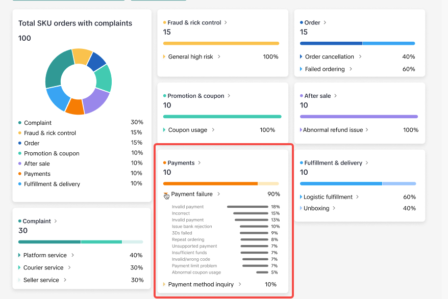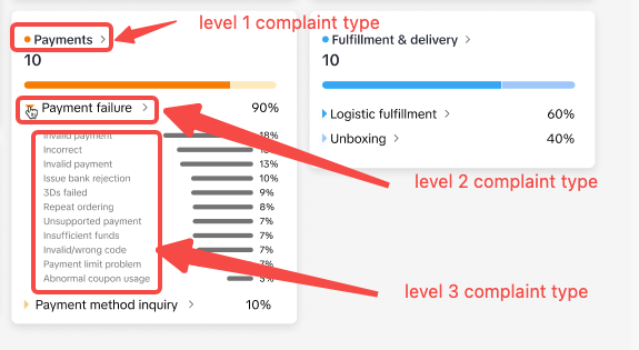 您可以按 2 级和 3 级投诉类型细分投诉总数,以获得更详细的见解。页面直接展示多个二级投诉类型以及每个一级投诉区块下的贡献。将鼠标悬停在“?”上图标查看定义。