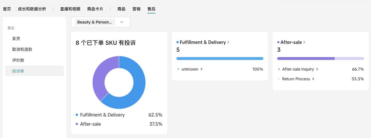 - 投诉总数和贡献:查看所选时间范围内您的店铺在所选类别中的有投诉的 SKU 订单总数。